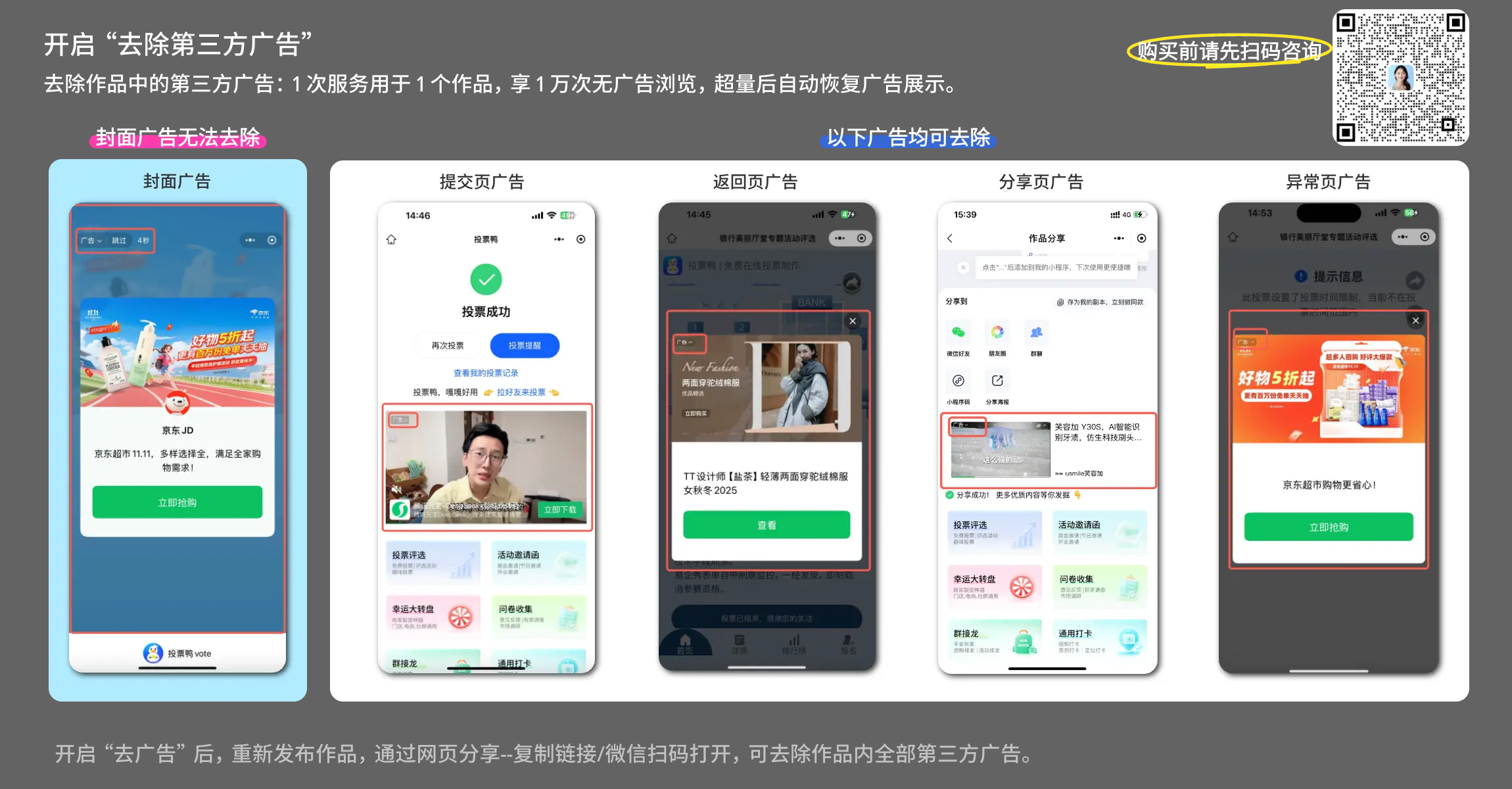 1.开启【去除第三方广告】后,重新发布作品-扫码打开,即可去除所有广告。