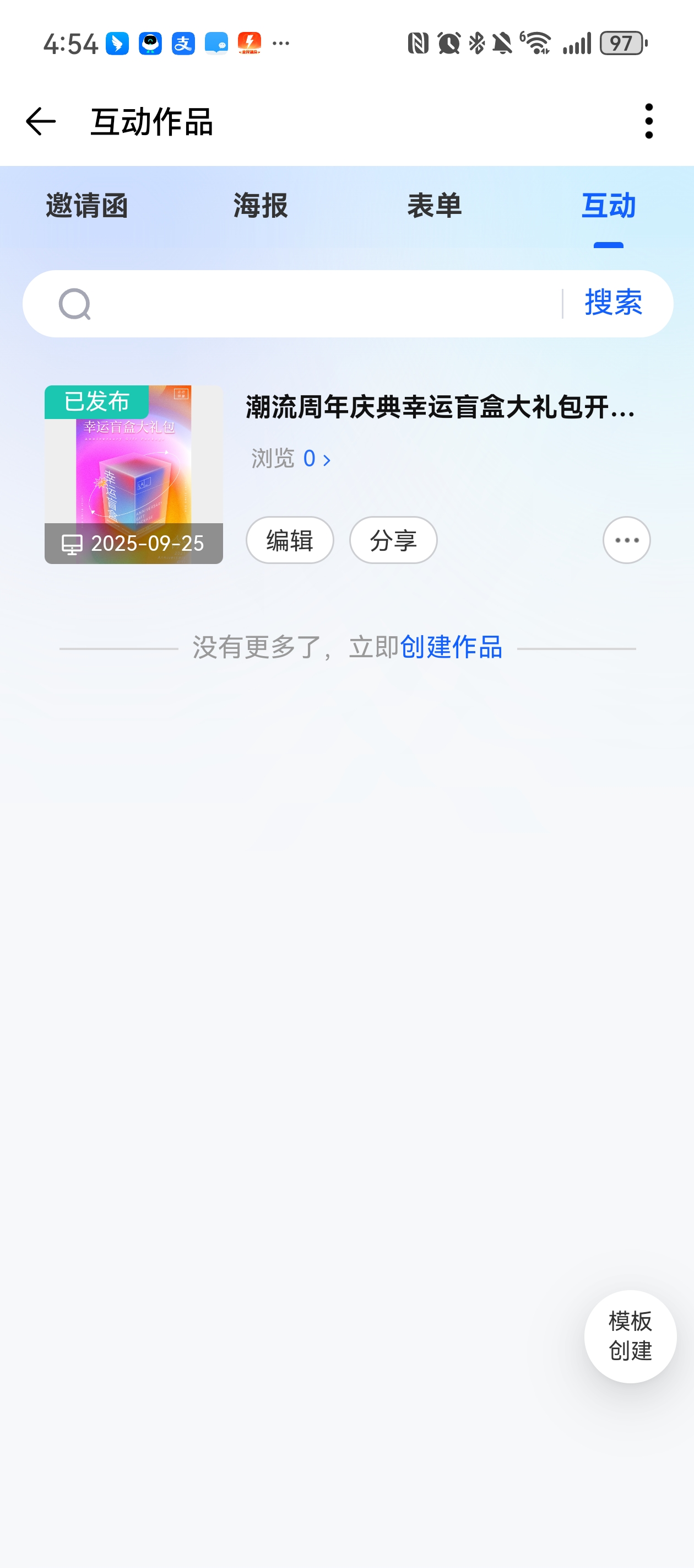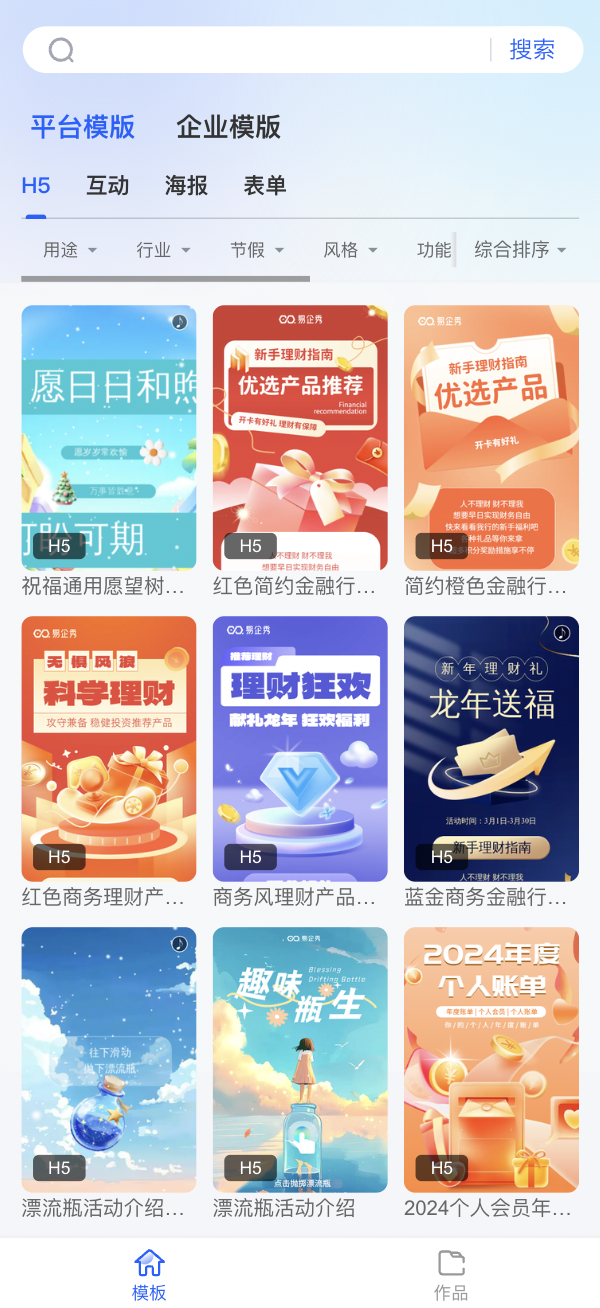 移动端包括了H5编辑器、互动编辑器(抽奖活动)、海报编辑器和表单编辑器,仅支持通过模板(企业模板/平台模板)创建作品,编辑器内支持编辑修改模板,发布后分享给访客,访客参与活动后,在wap端可查看相关数据。