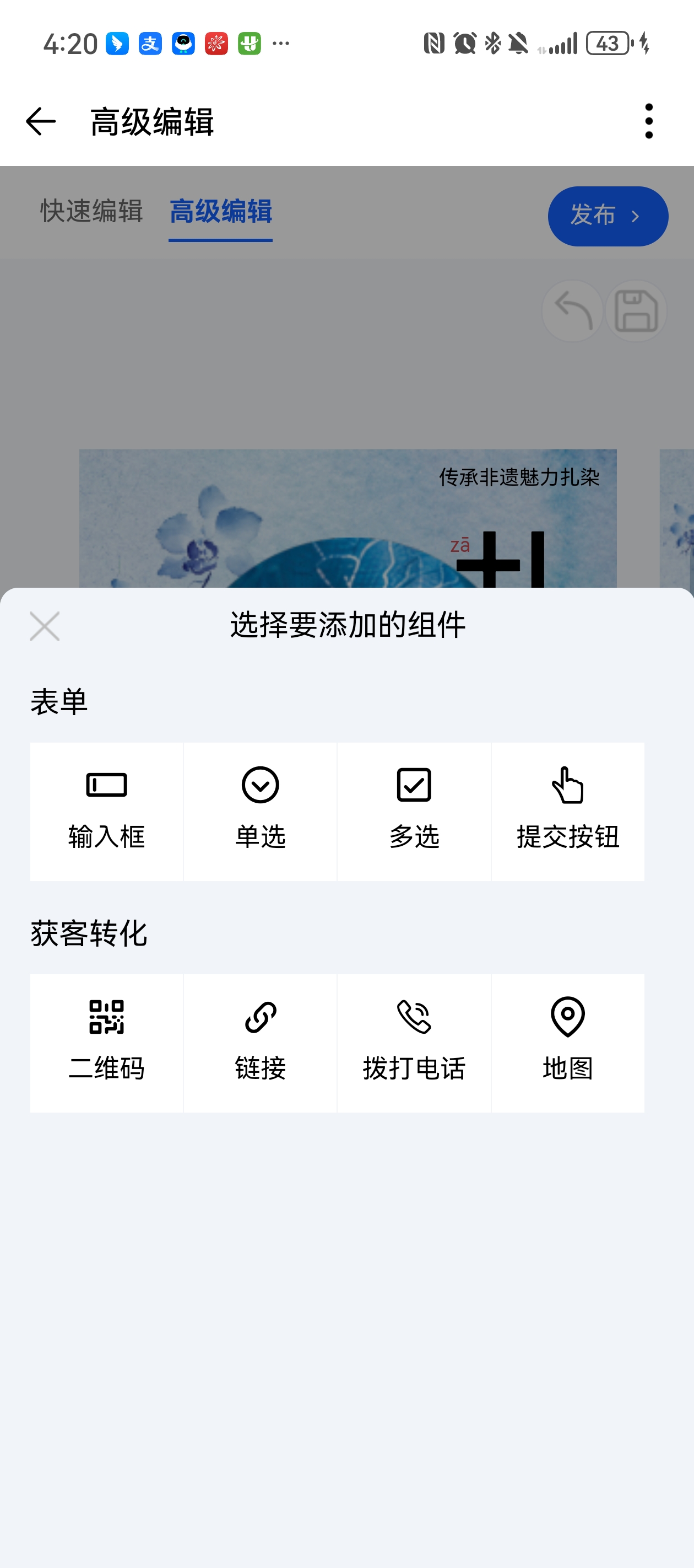 2.7、点击添加组件,出现添加组件的弹框,包括输入框、单选、多选、提交按钮;二维码、链接、拨打电话和地图组件。