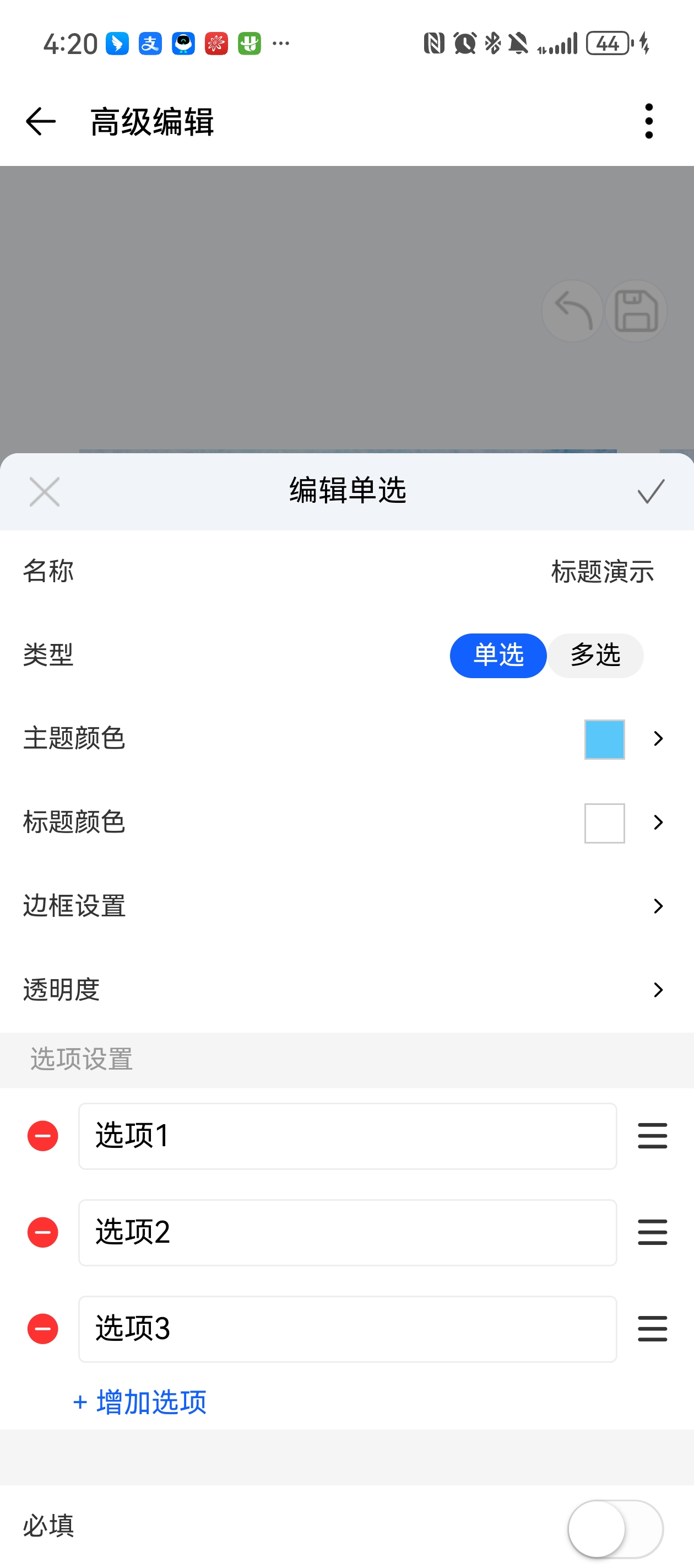 点击添加单选,出现编辑单选,支持修改名称,切换选择是单选还是多选,支持修改主体颜色、标题颜色、边框设置和透明度,支持编辑选项,调整选项的排序;