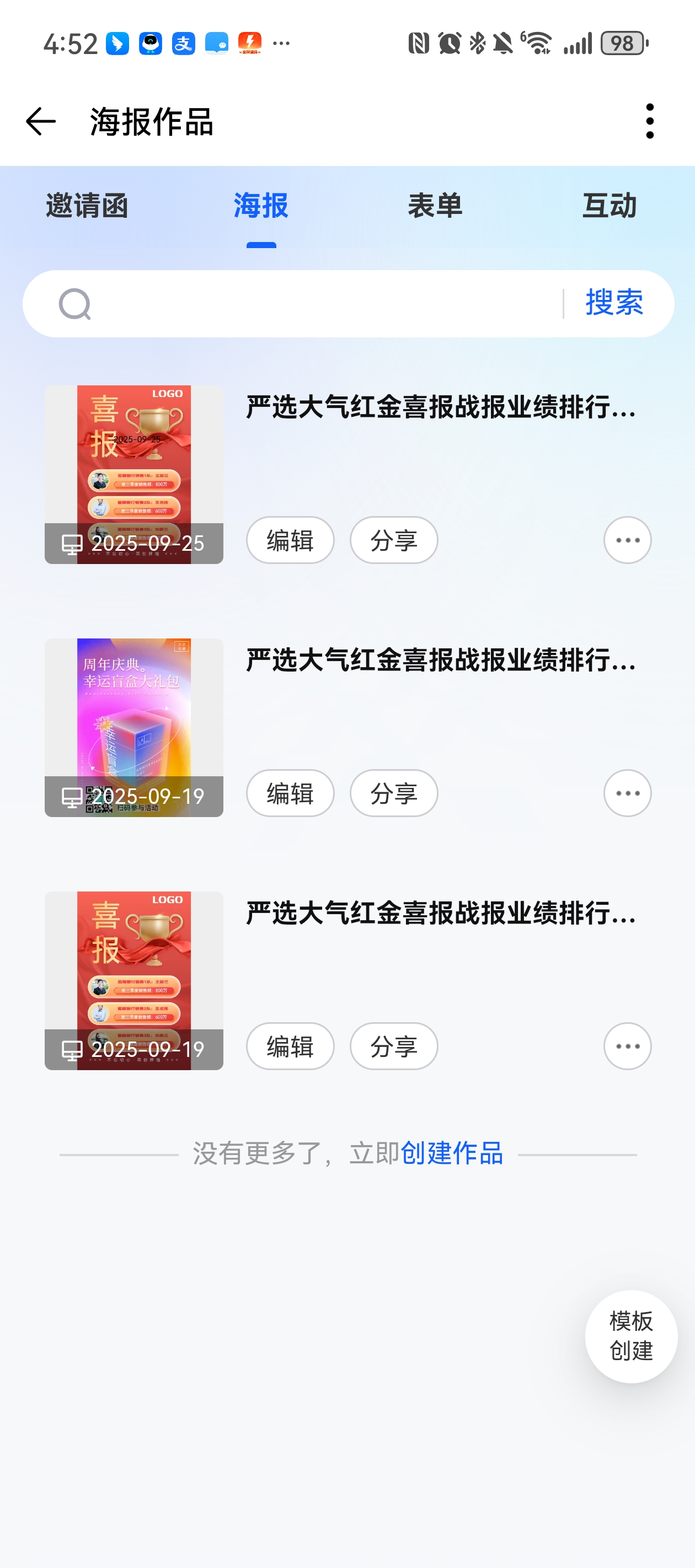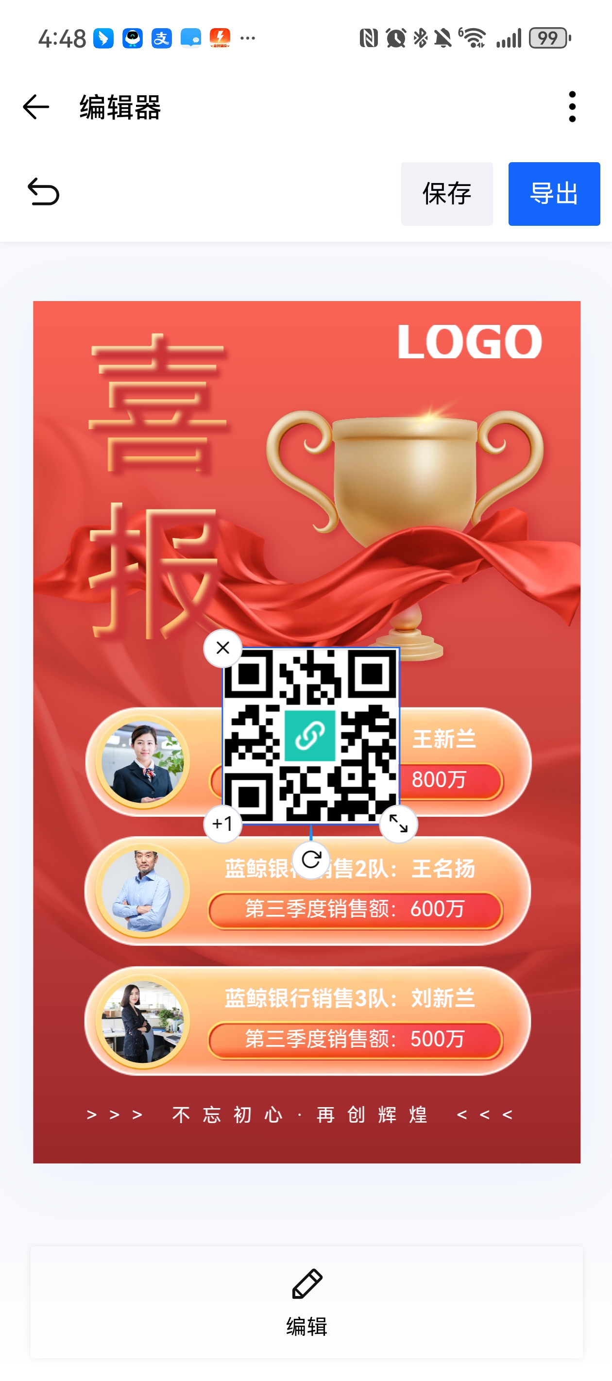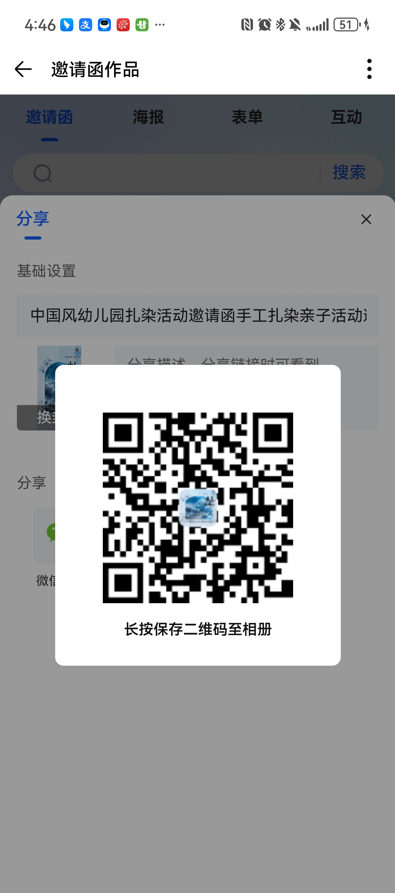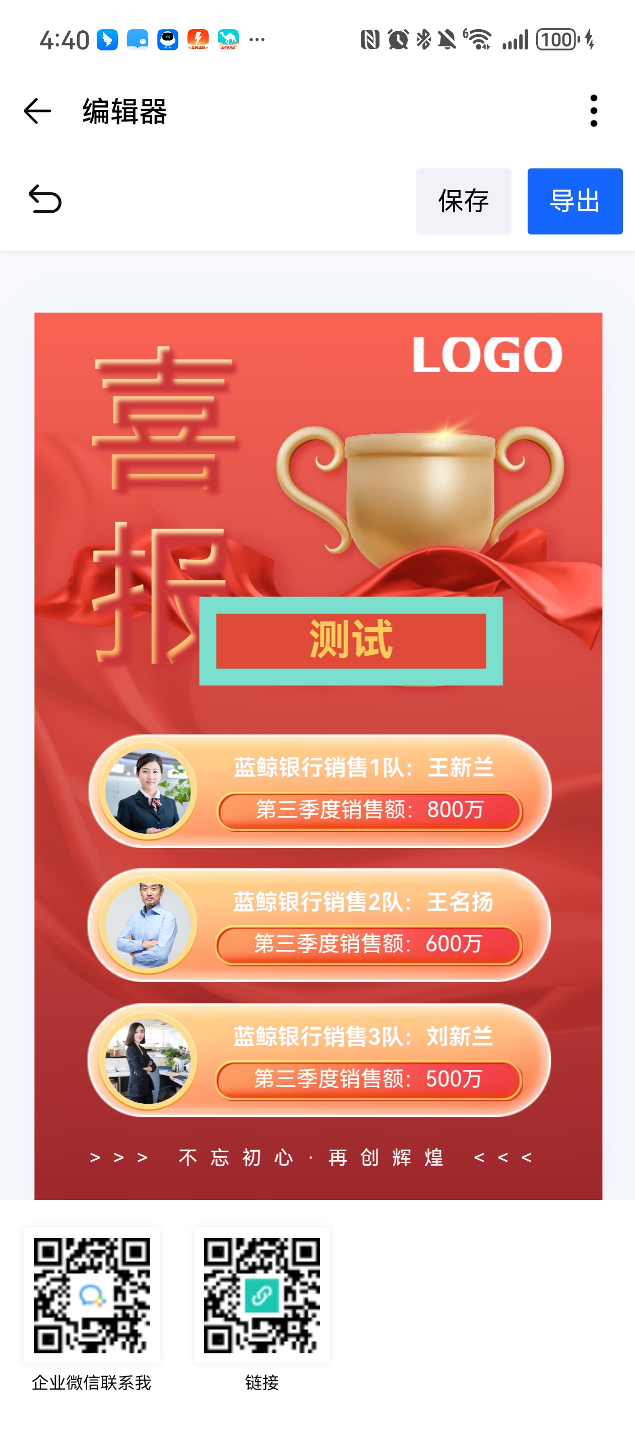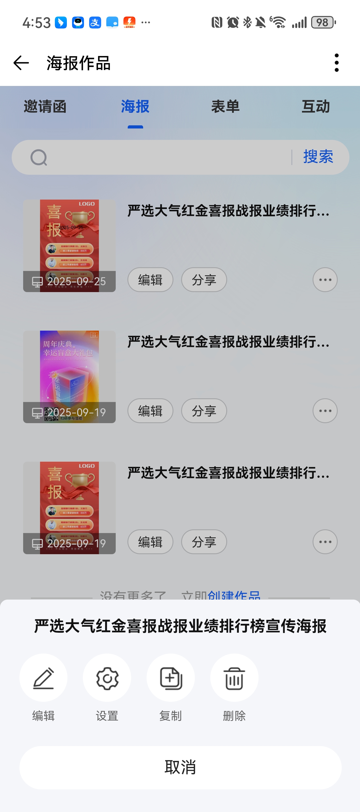 3、修改之后,点击右上角导出,到我的作品列表,海报页面,支持点击编辑进入编辑器进行修改,点击分享进入预览页面,支持长按保存至手机,支持编辑海报名称和描述,支持复制和删除海报。