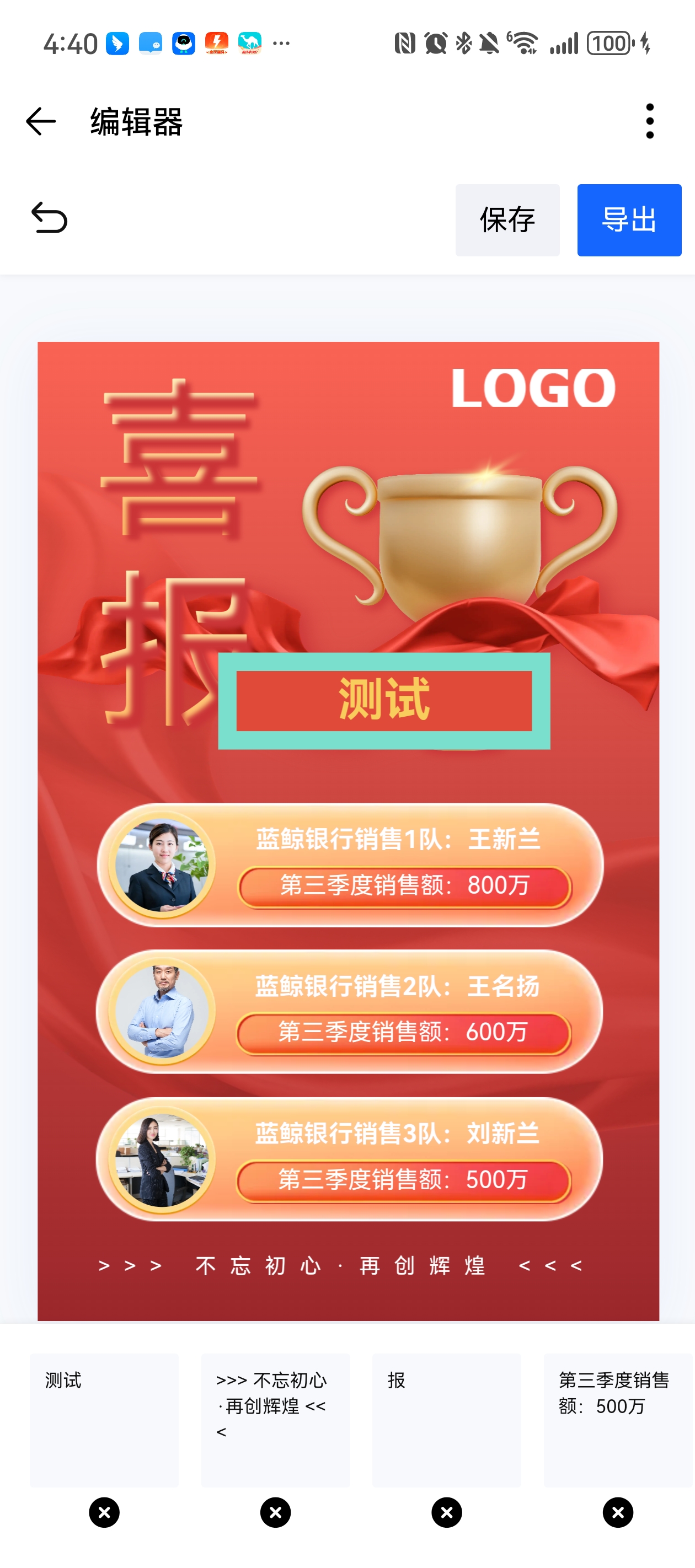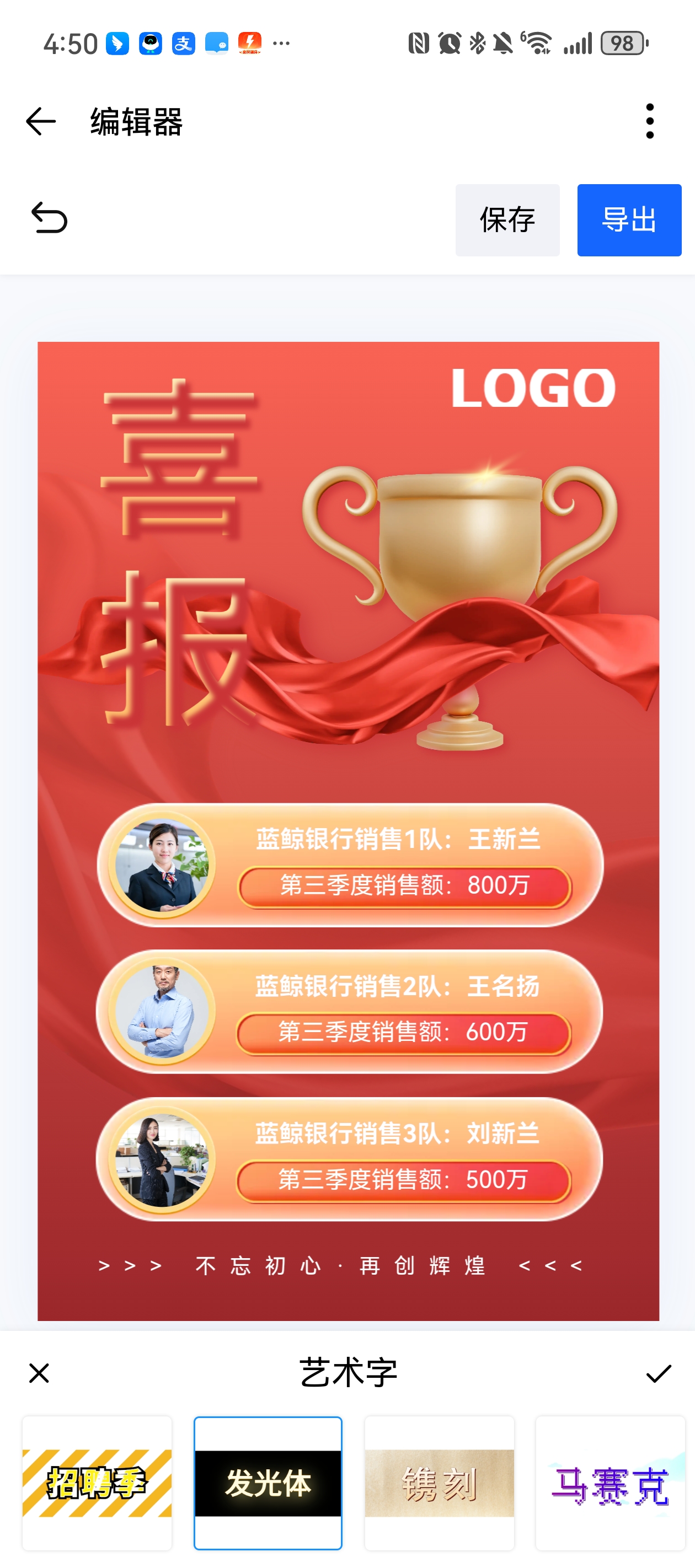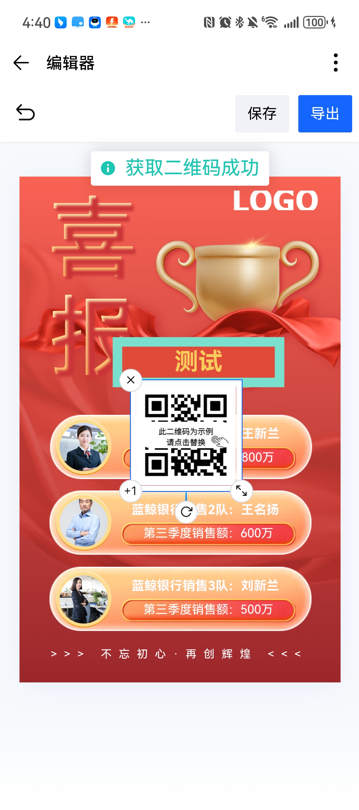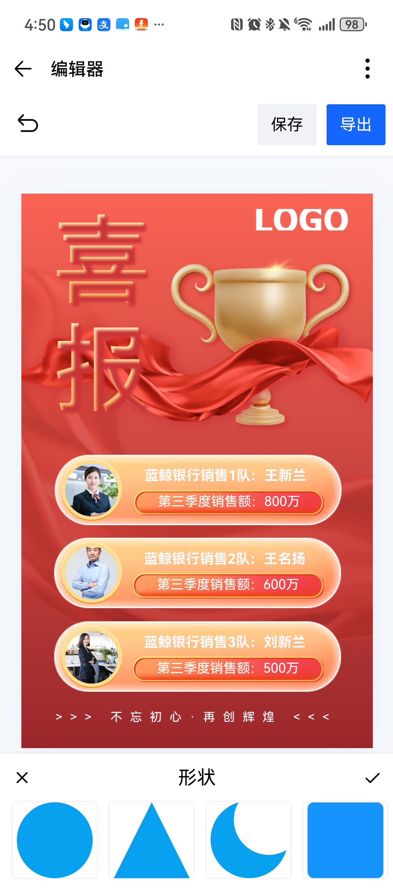 3、修改之后,点击右上角导出,到我的作品列表,海报页面,支持点击编辑进入编辑器进行修改,点击分享进入预览页面,支持长按保存至手机,支持编辑海报名称和描述,支持复制和删除海报。