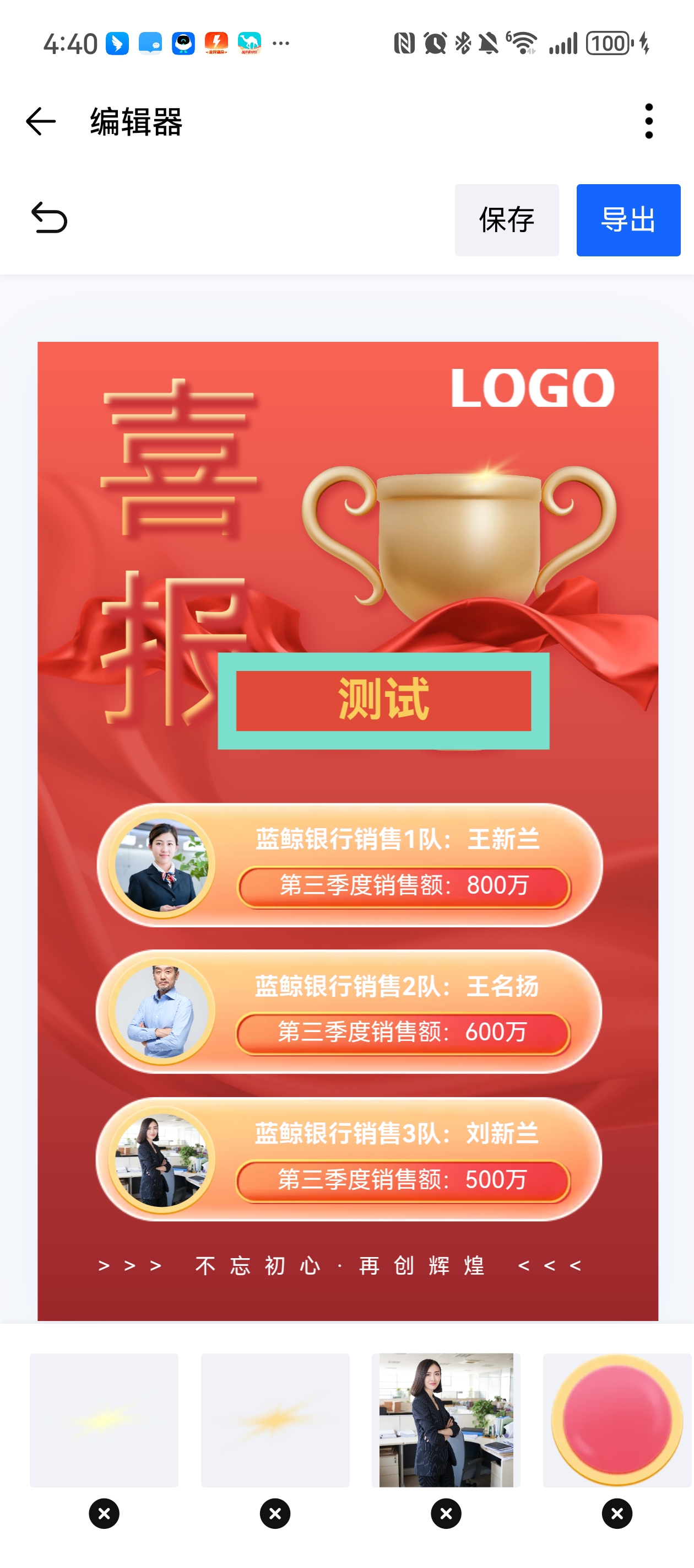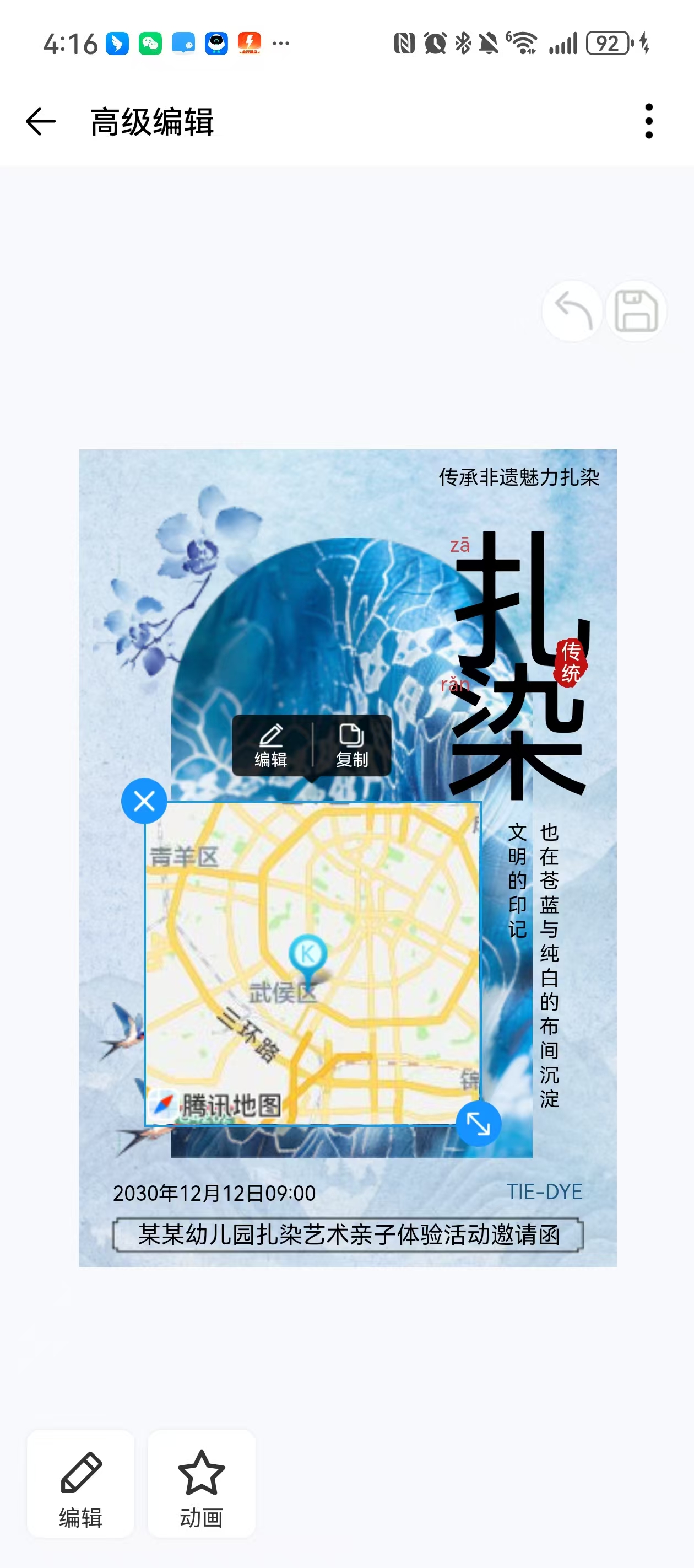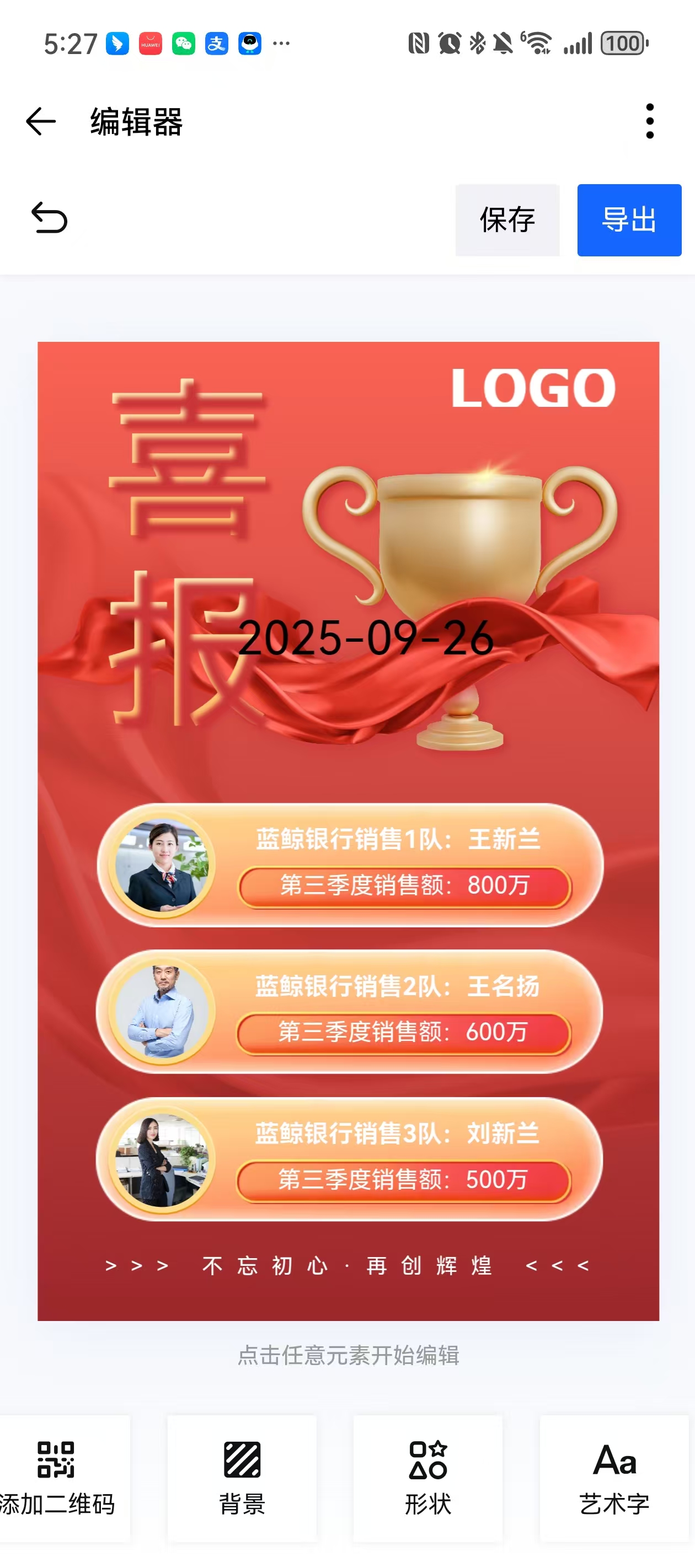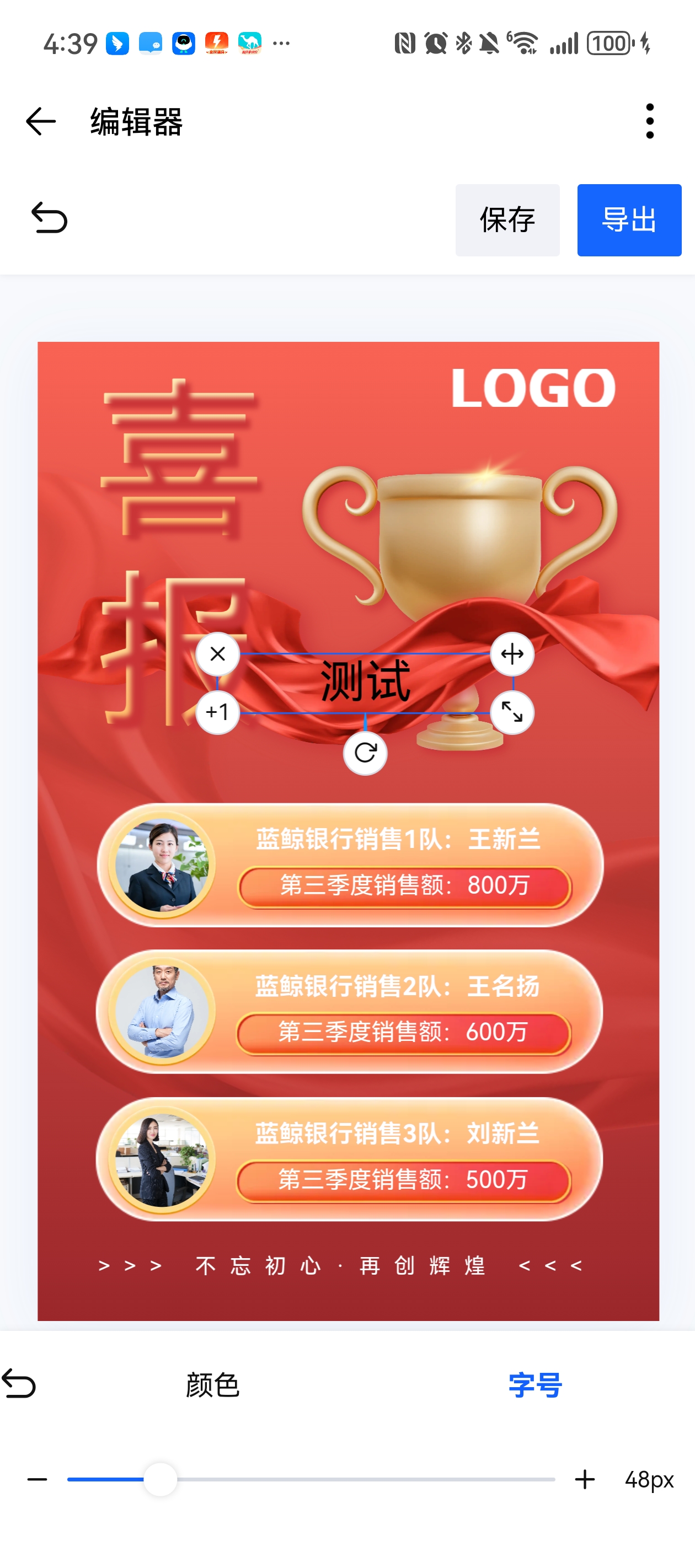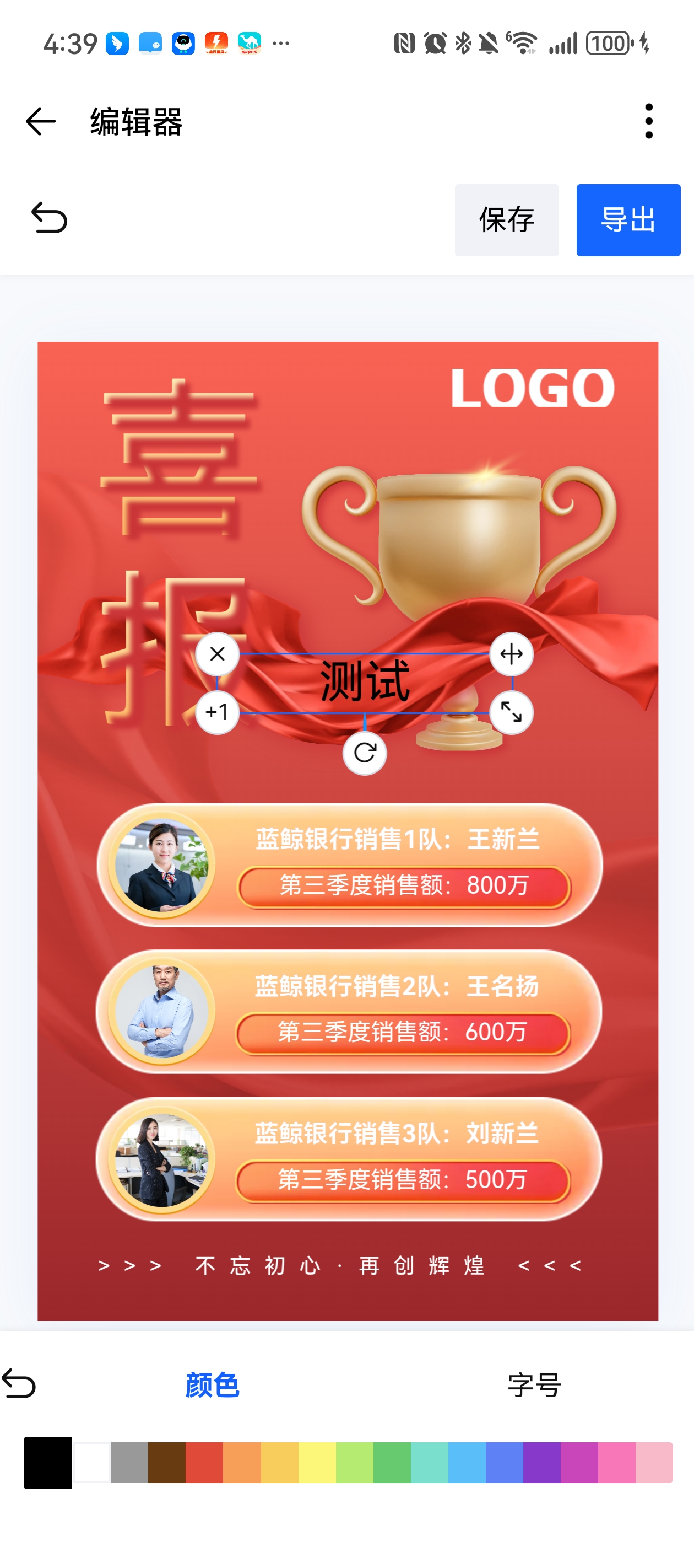 3、修改之后,点击右上角导出,到我的作品列表,海报页面,支持点击编辑进入编辑器进行修改,点击分享进入预览页面,支持长按保存至手机,支持编辑海报名称和描述,支持复制和删除海报。