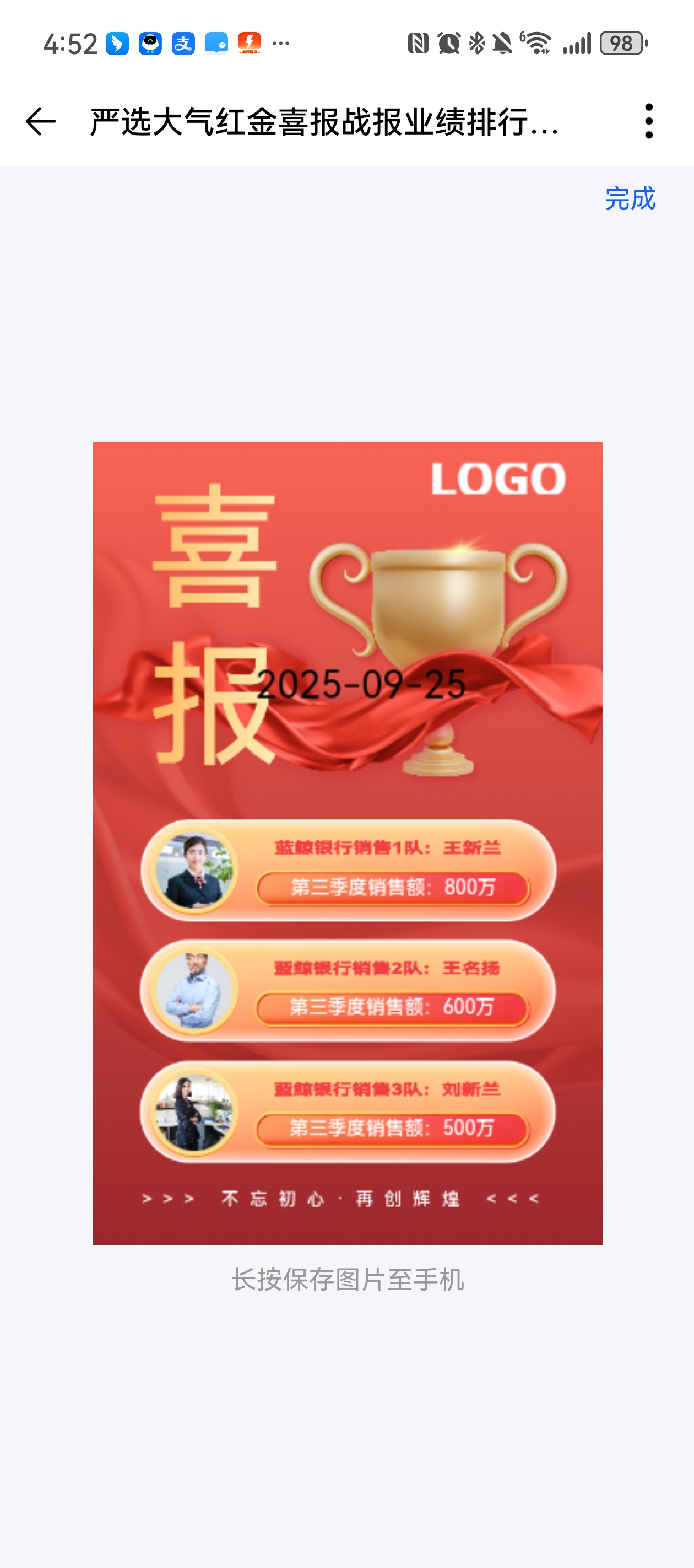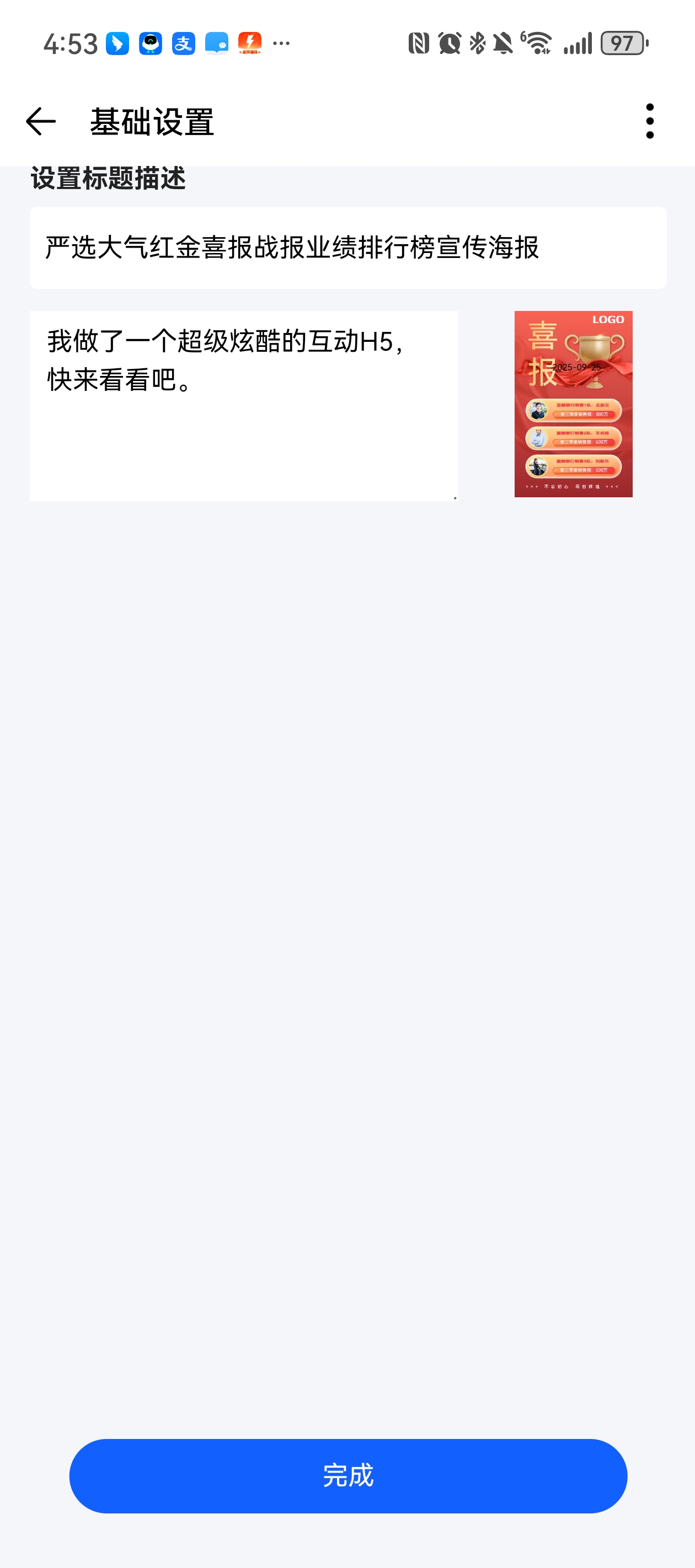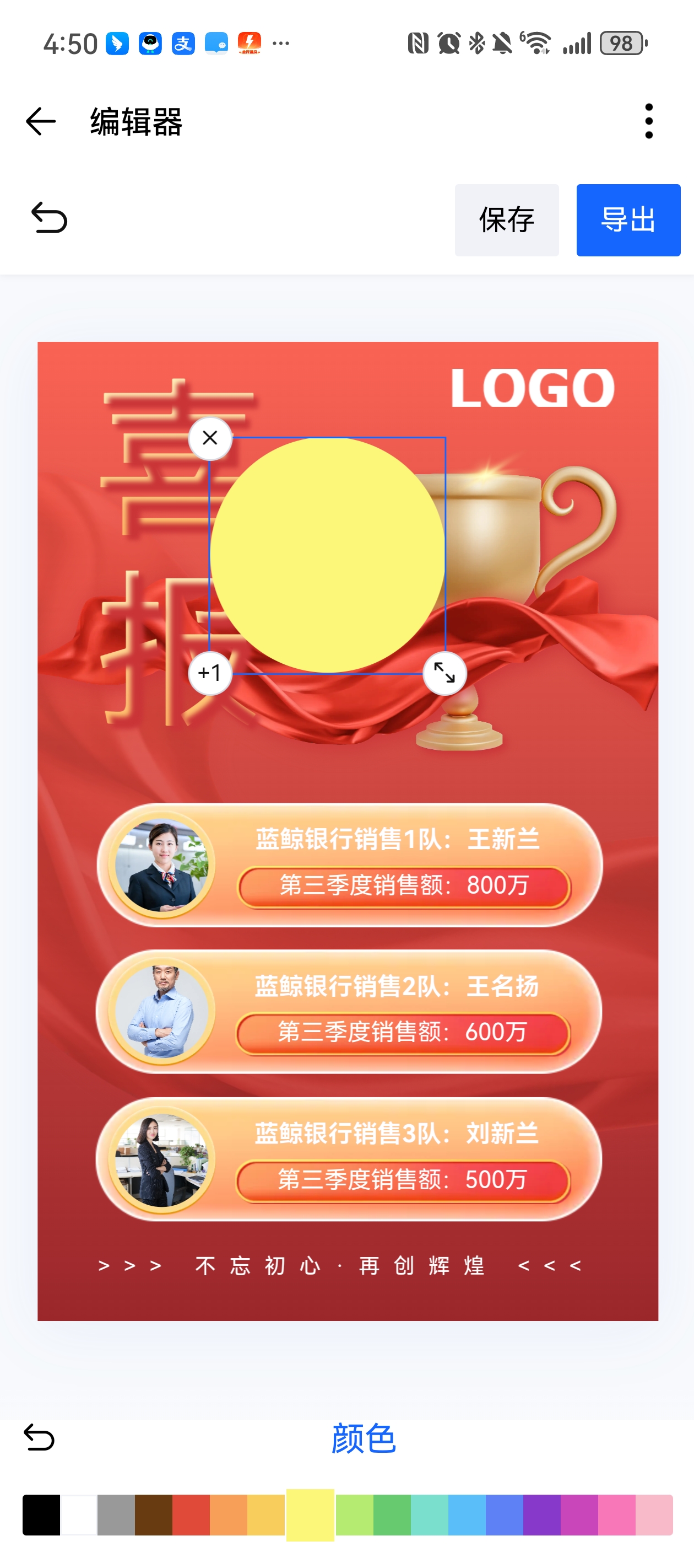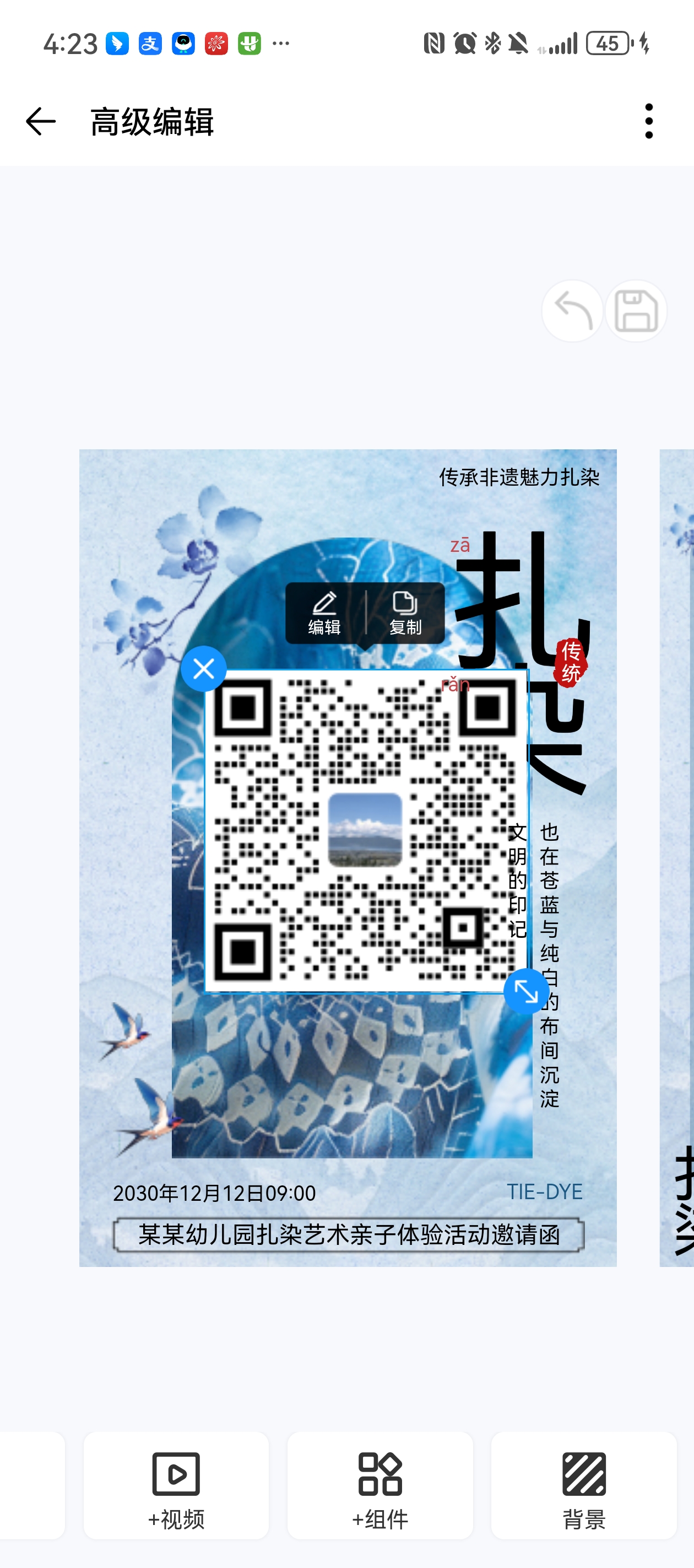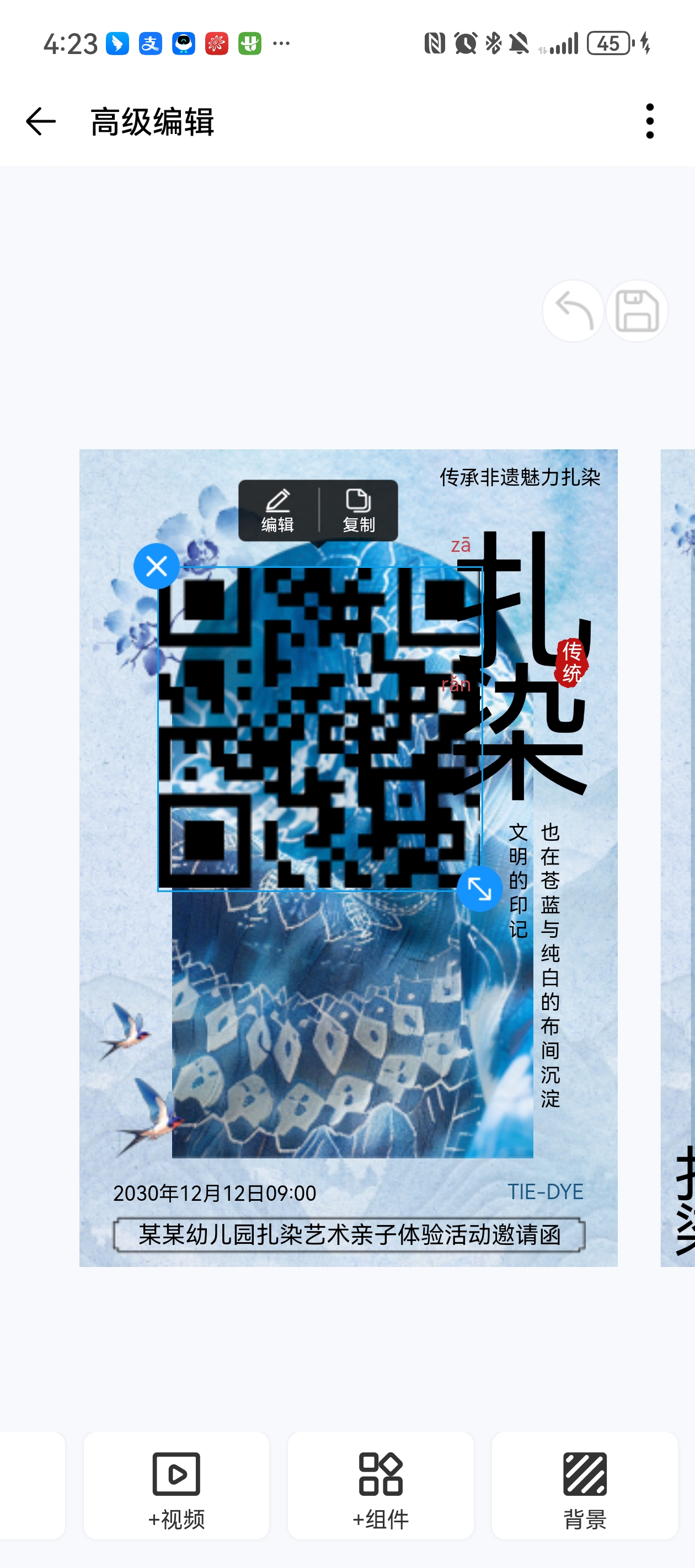 3、修改之后,点击右上角导出,到我的作品列表,海报页面,支持点击编辑进入编辑器进行修改,点击分享进入预览页面,支持长按保存至手机,支持编辑海报名称和描述,支持复制和删除海报。