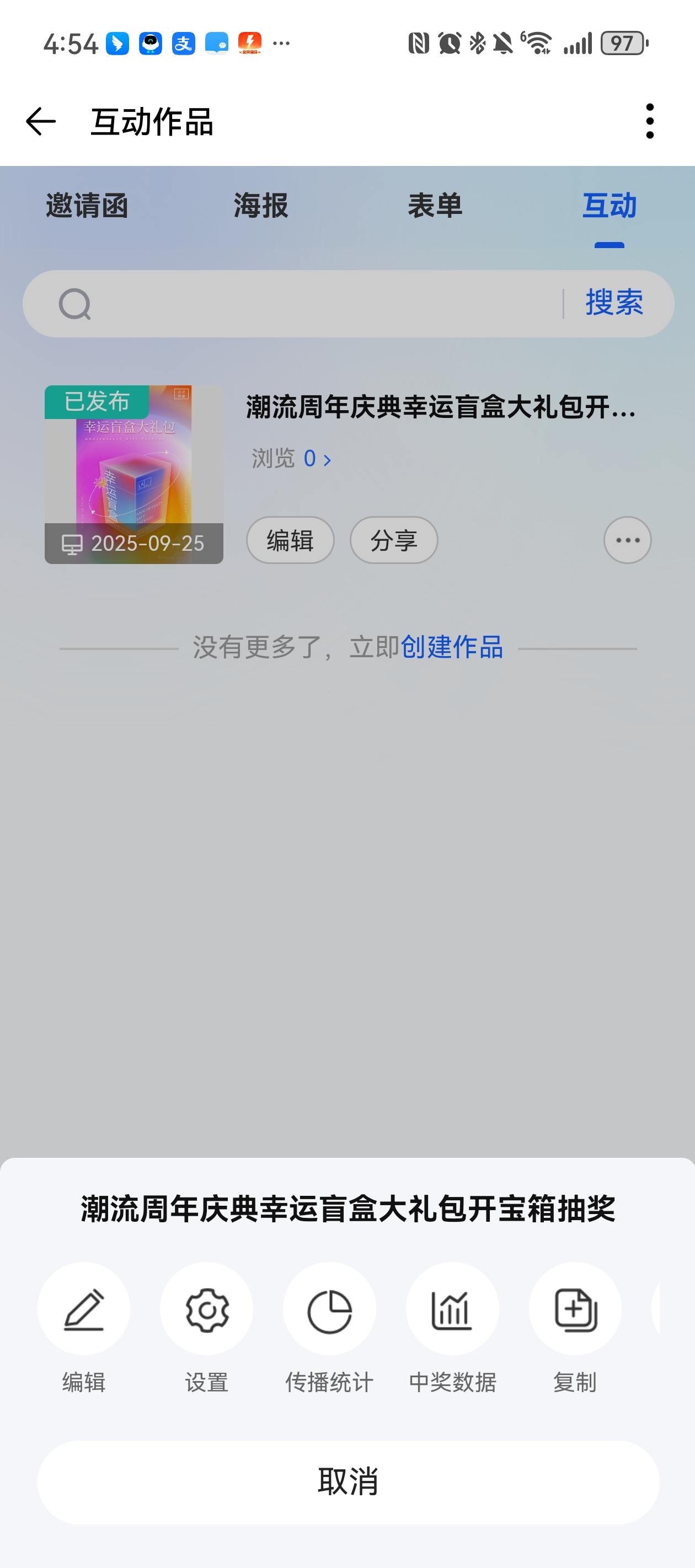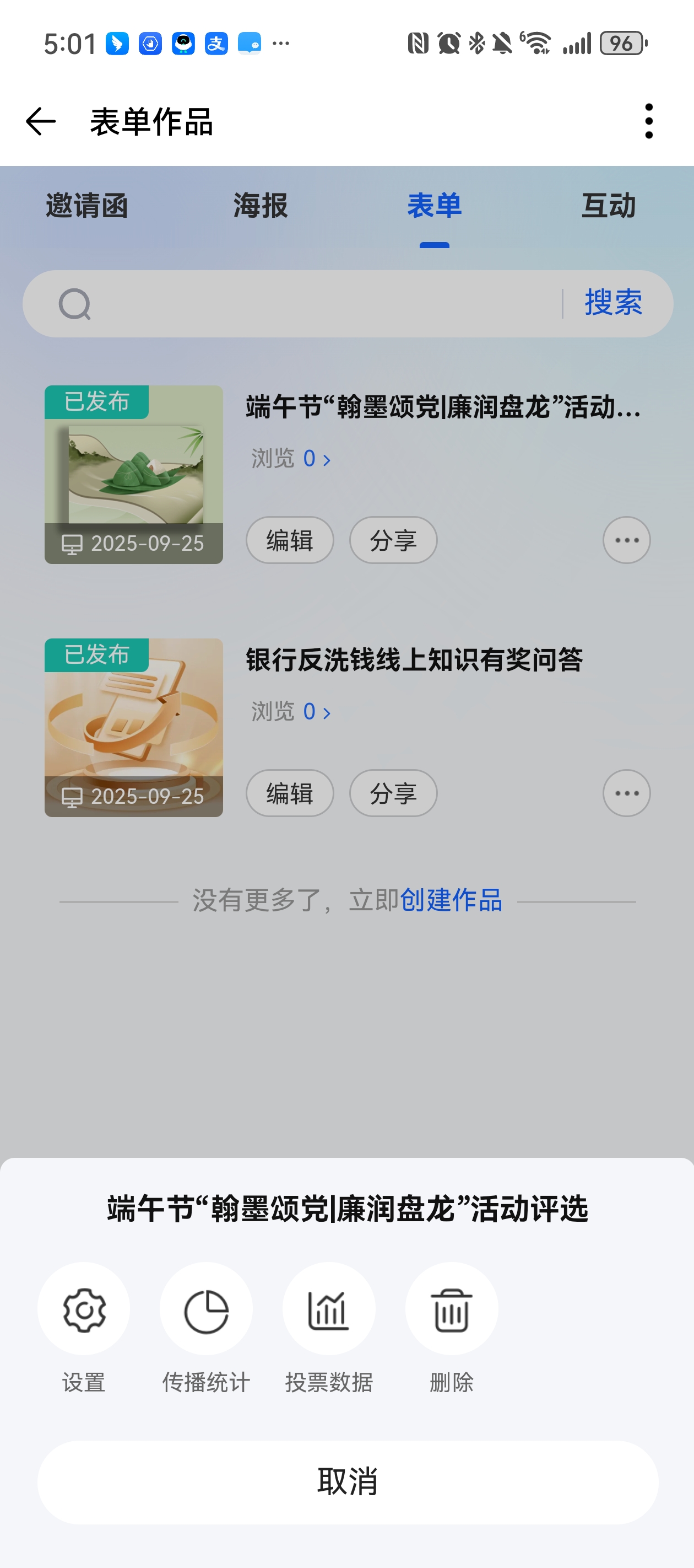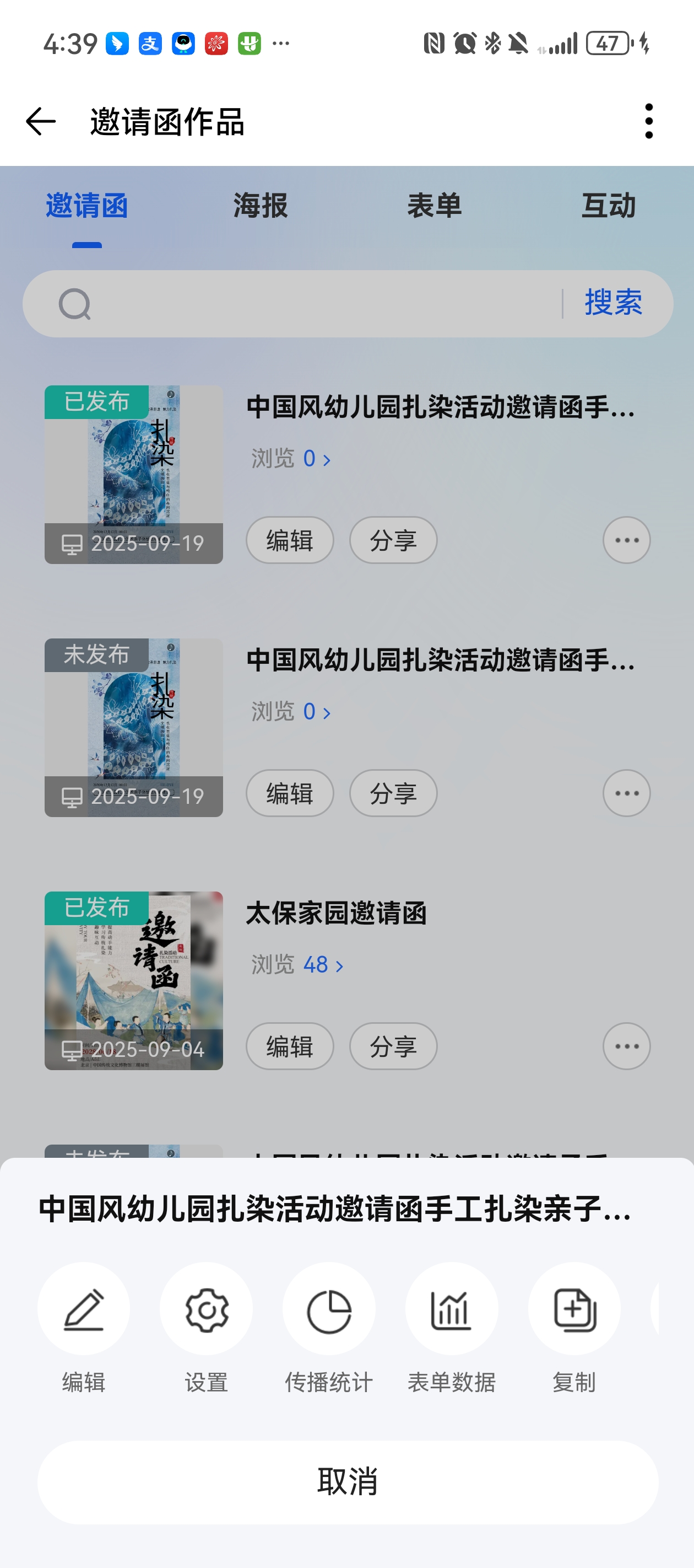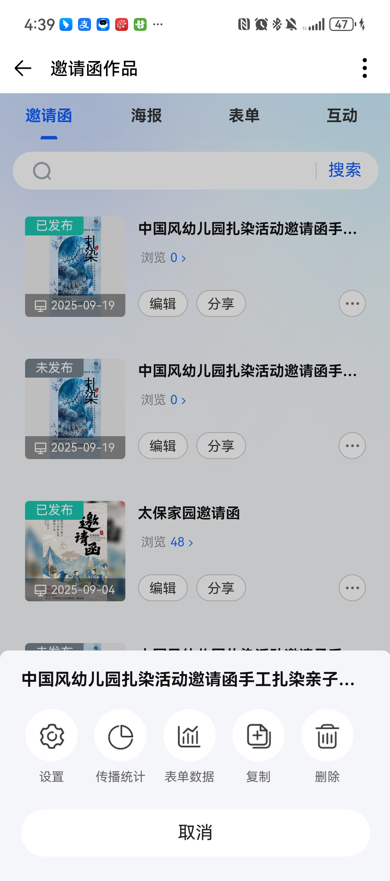 支持查看传播统计数据和表单数据,支持复制作品、删除作品、修改作品的封面、标题、描述等;