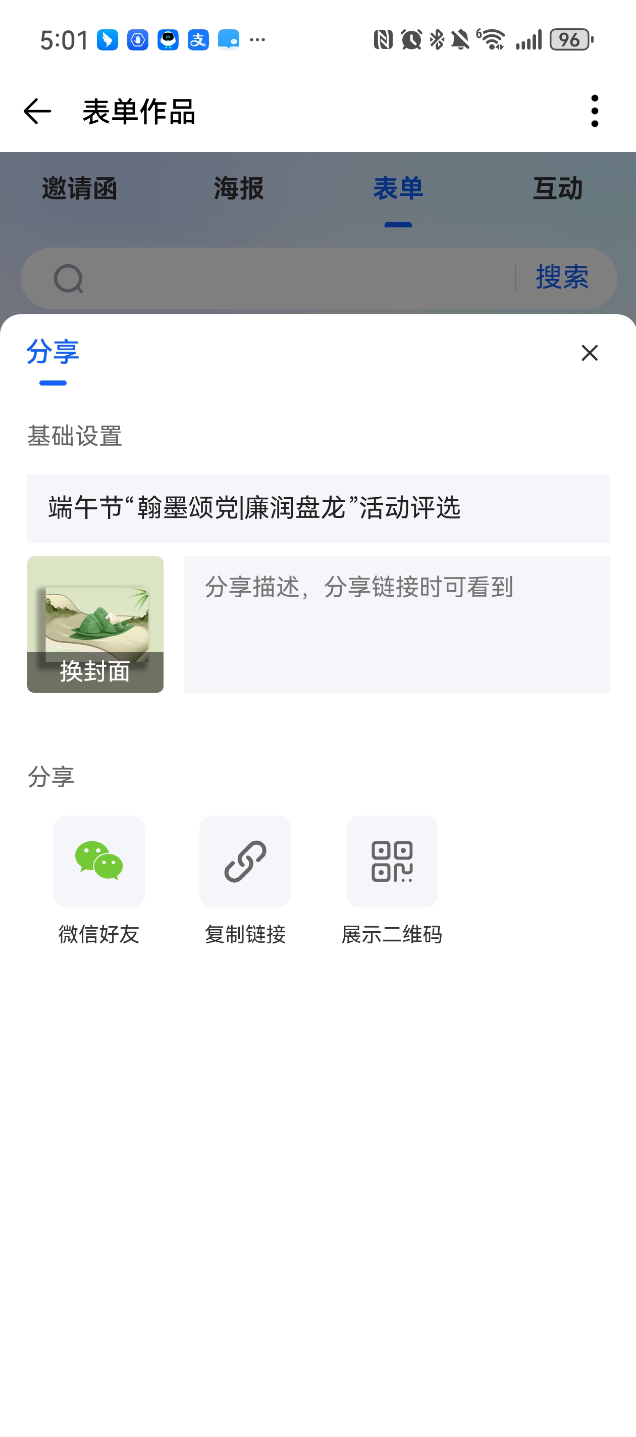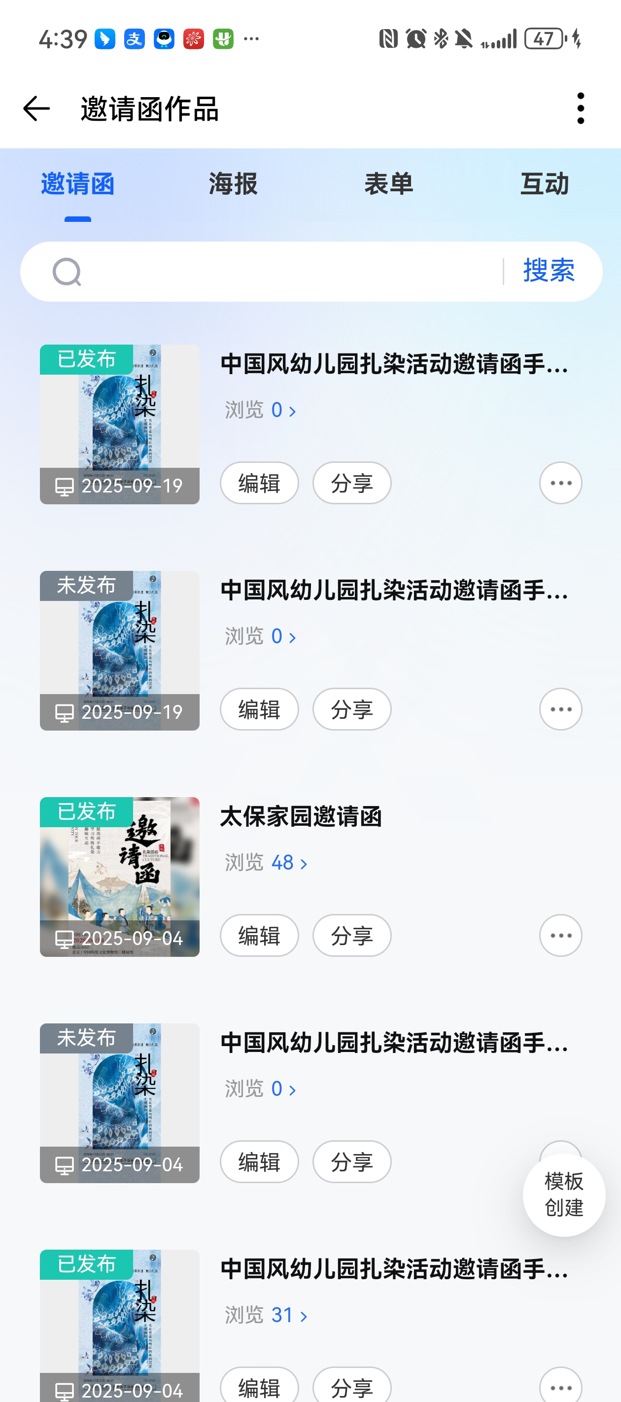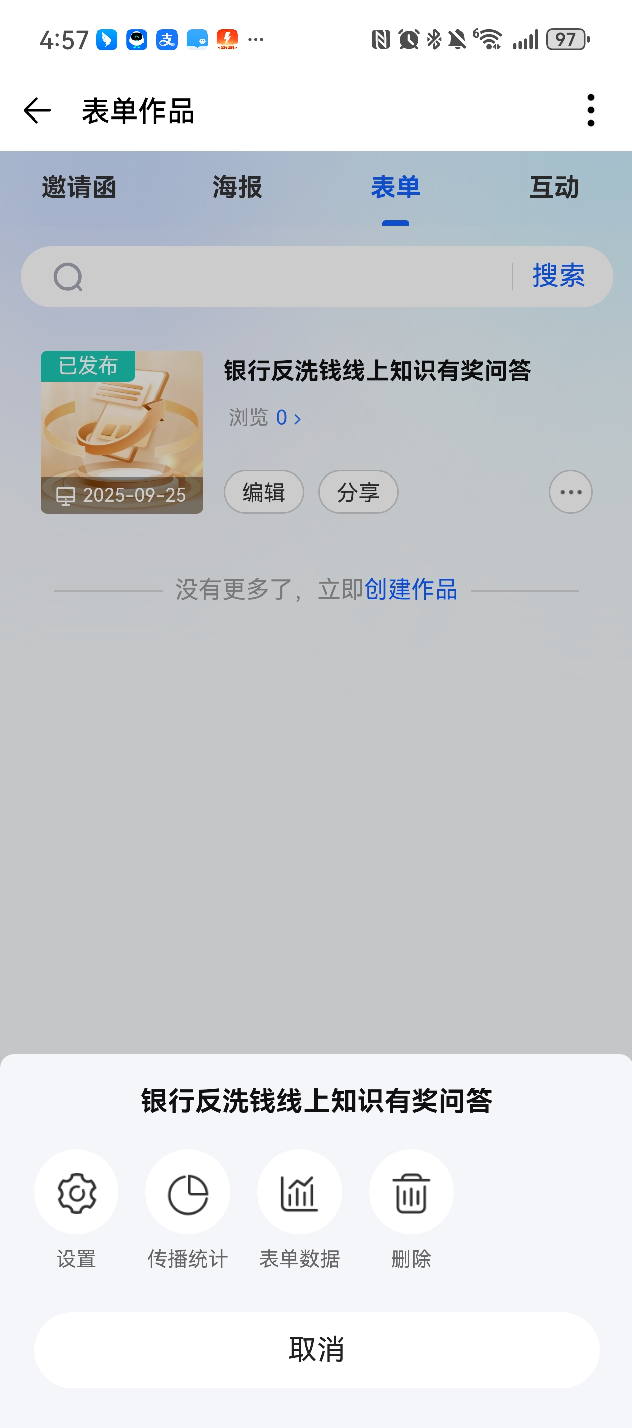 支持查看传播统计数据和表单数据,支持复制作品、删除作品、修改作品的封面、标题、描述等;