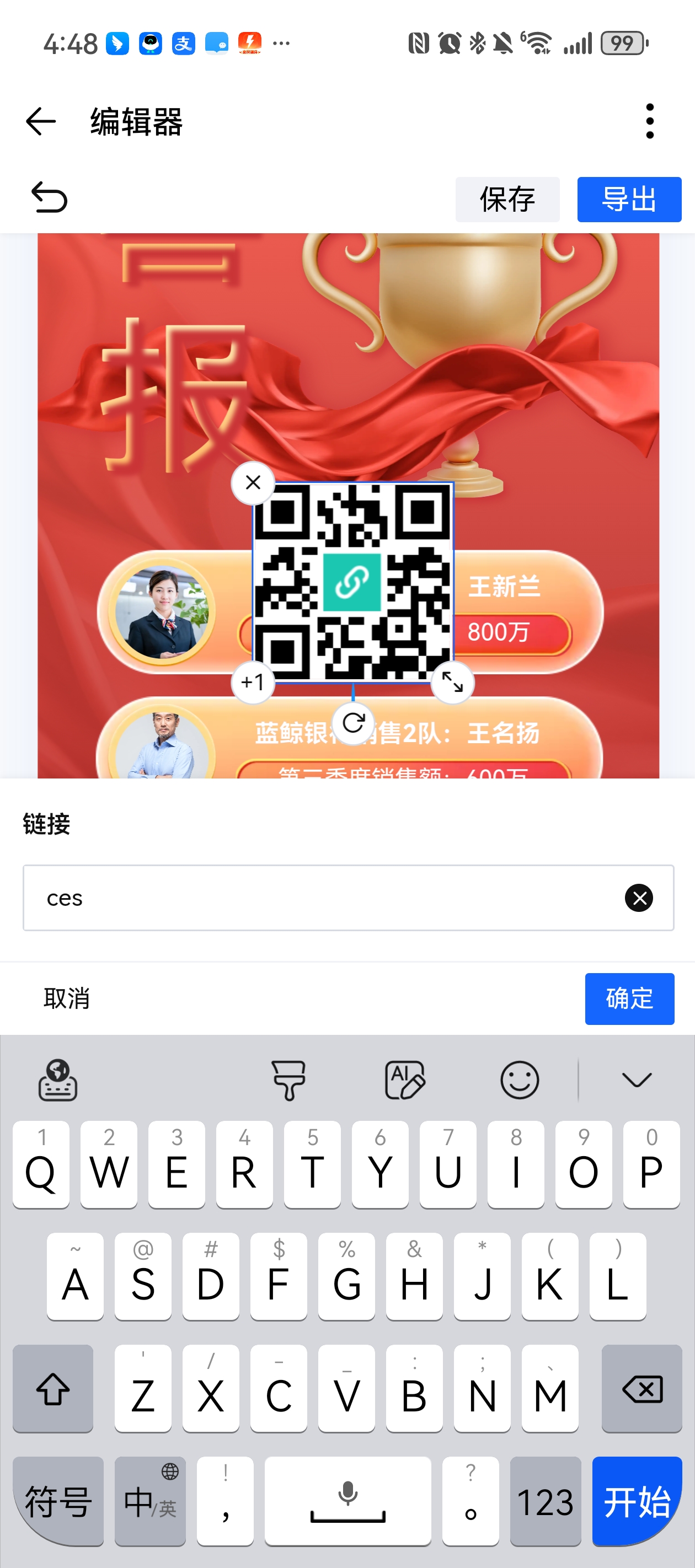 点击添加链接二维码,会出现添加链接,添加链接完成之后,生成链接二维码在画布中;