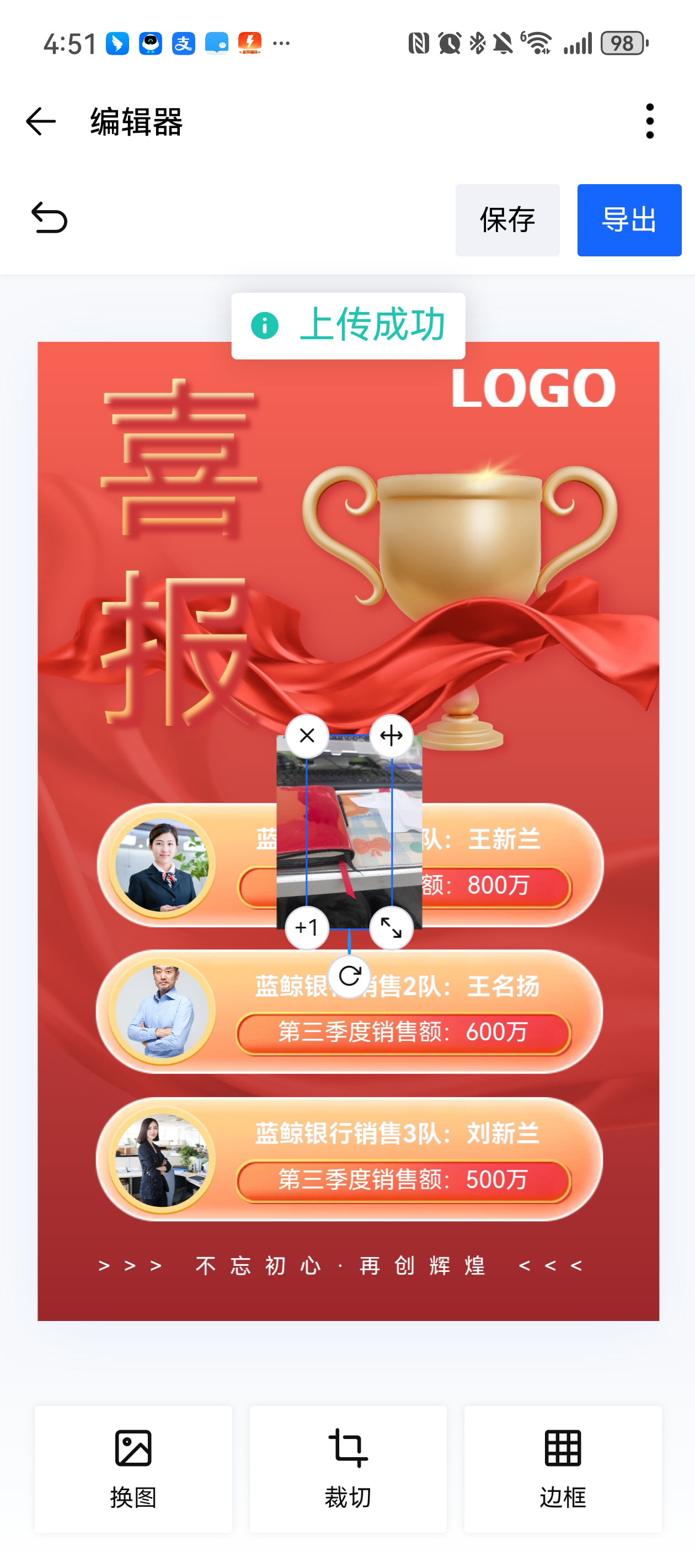 2.3、在海报编辑器中,点击添加图片,弹出选择上传方式,通过拍照或者选择图片库中的图片,选择之后,出现图片裁剪,支持形状裁剪和比例裁剪,点击确定,添加到画布中;支持拖拽图片的位置、拖动改变图片的大小尺寸;支持添加图片边框,修改图片边框的颜色;
