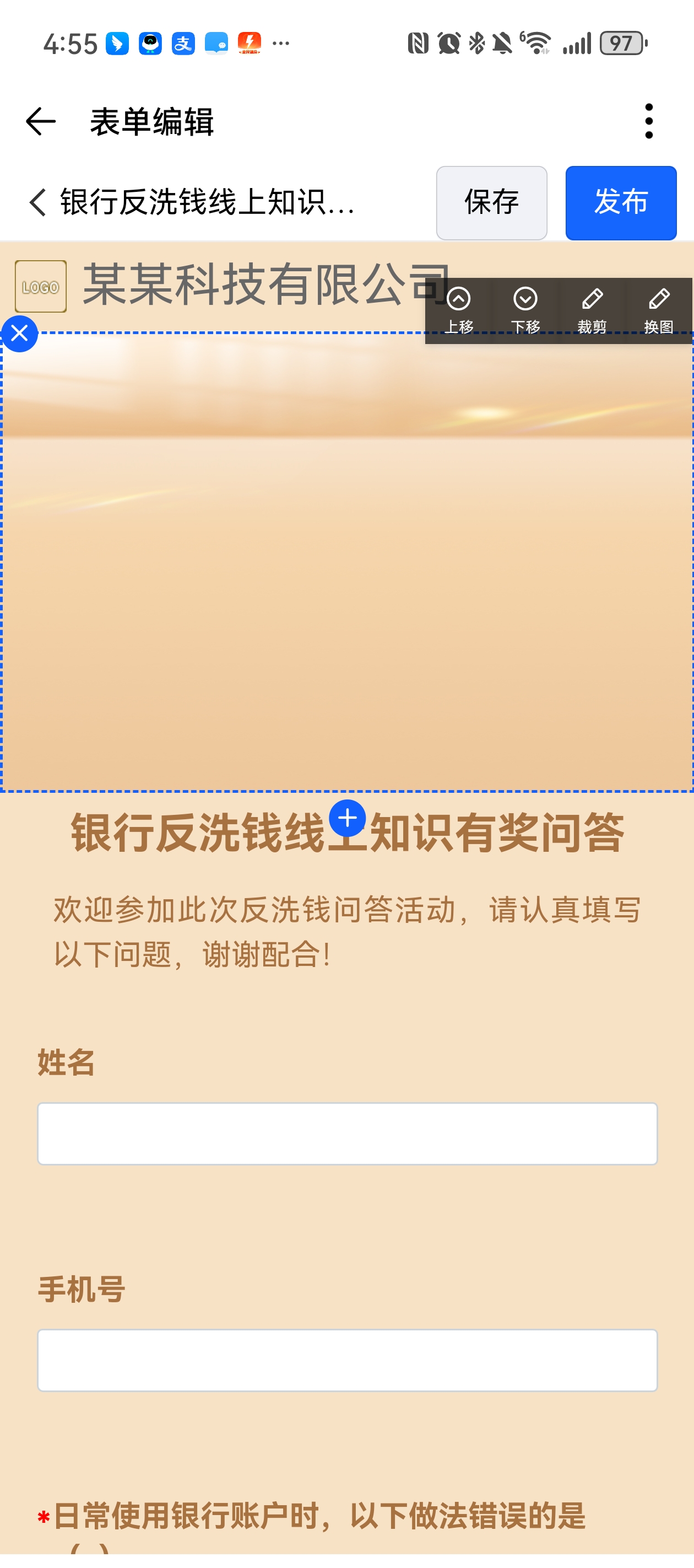1、问卷类,点击使用进入编辑器,支持对海报中的文字、图片、组件进行编辑、复制、删除、移动位置;
