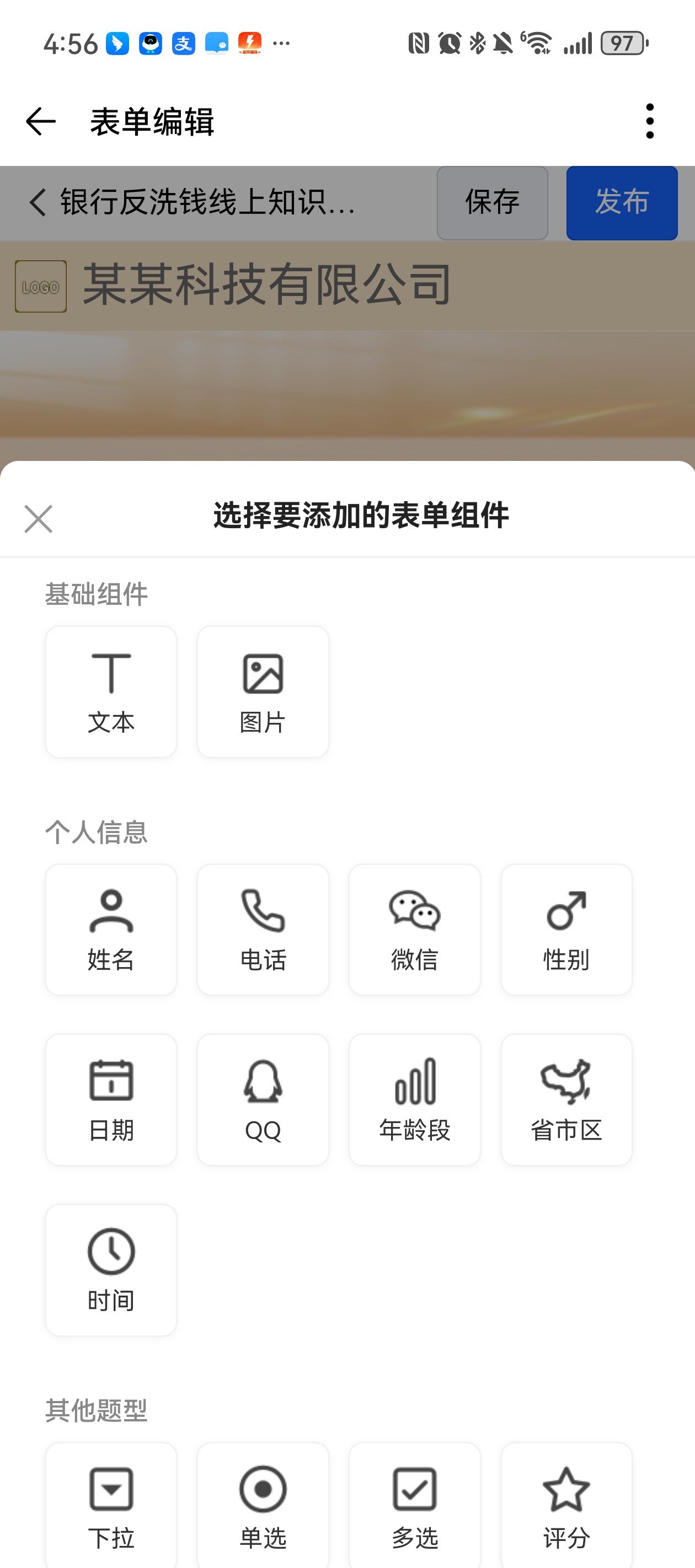 1.1、支持添加组件,包括添加文字、图片、姓名输入框、电话输入框、微信输入框、性别选择框、日期选择框、QQ输入框、年龄段选择框、省市区选择框、时间选择框
