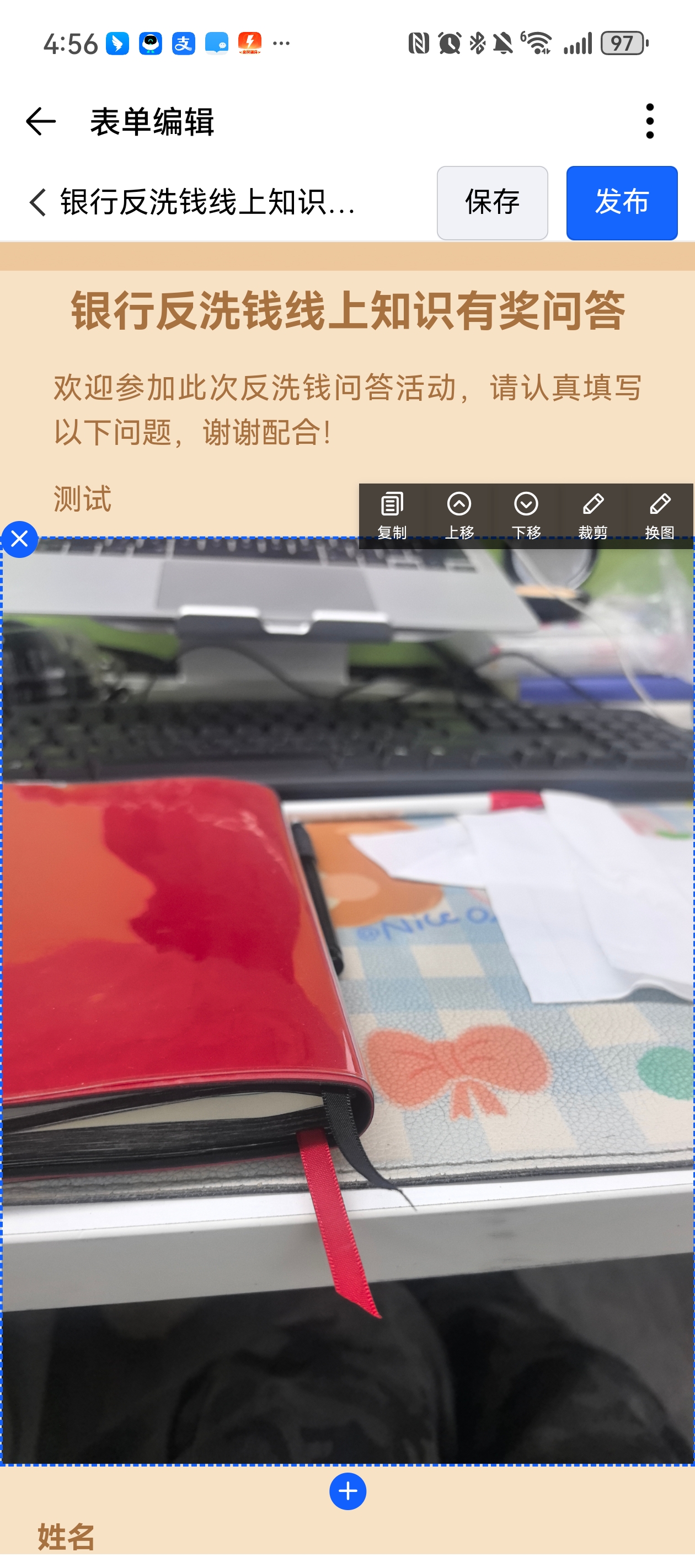 支持添加下拉选择框、单选题、多选题和评分题,每个组件都支持编辑、上下移动位置、复制和删除;