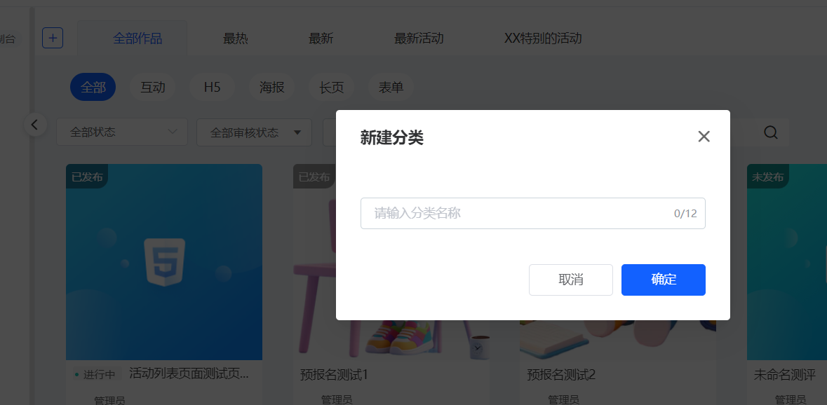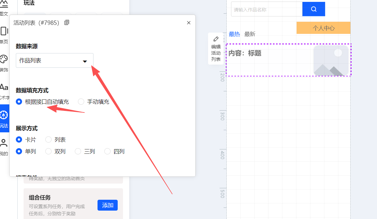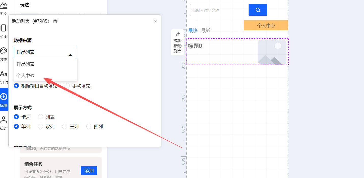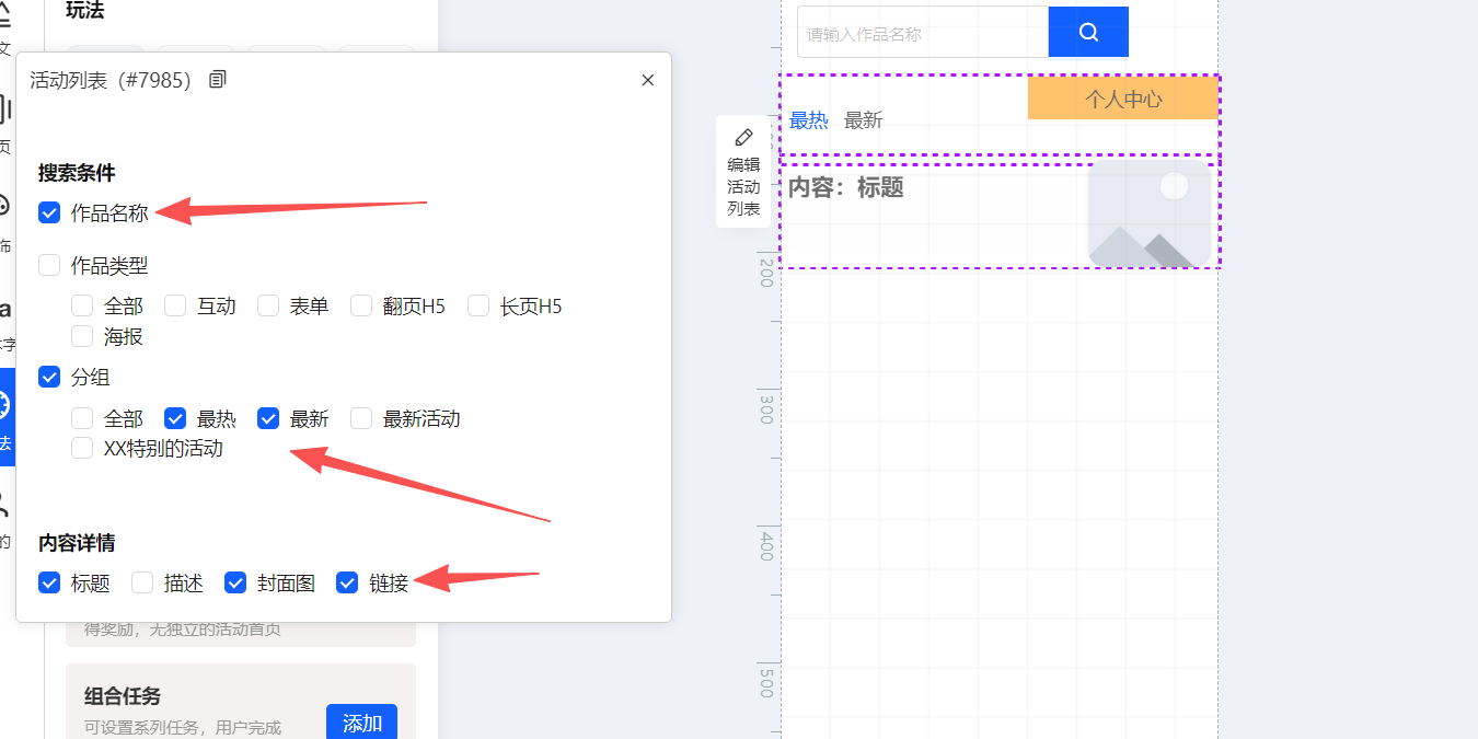 ## 一、创建需要的分类 在企业作品--新增分类,增加需要在活动列表中展示的分类,例如需要有最新和最热分类,如图所示:   ## 二、在表单编辑器创建好需要上架到活动列表的表单作品 1、创建一个表单作品 2、需要添加剩余名额组件,用于查看剩余人数  3、在设置需要选择填写多少关闭表单,这个数量就是本次表单报名的名额,另外建议填写次数限制为1次  4、表单设置添加时间限制,可以在个人中心区分该活动是否结束  ## 三、把创建好的表单作品,按照需求,把活动移动到对应的分类中  ## 四、创建活动列表 1、打开H5编辑器,选择活动列表组件  2、选择作品列表,数据填充方式和展示方式 默认即可  3、搜索条件勾选作品名称,分组按照自己需要的分组勾选,内容详情建议标题+封面+链接  ## 五、创建个人中心 1、打开H5编辑器,在之前的活动列表页上,新增一页,选择活动列表组件 2、选择个人中心接口  其他选择和活动列表勾选一样