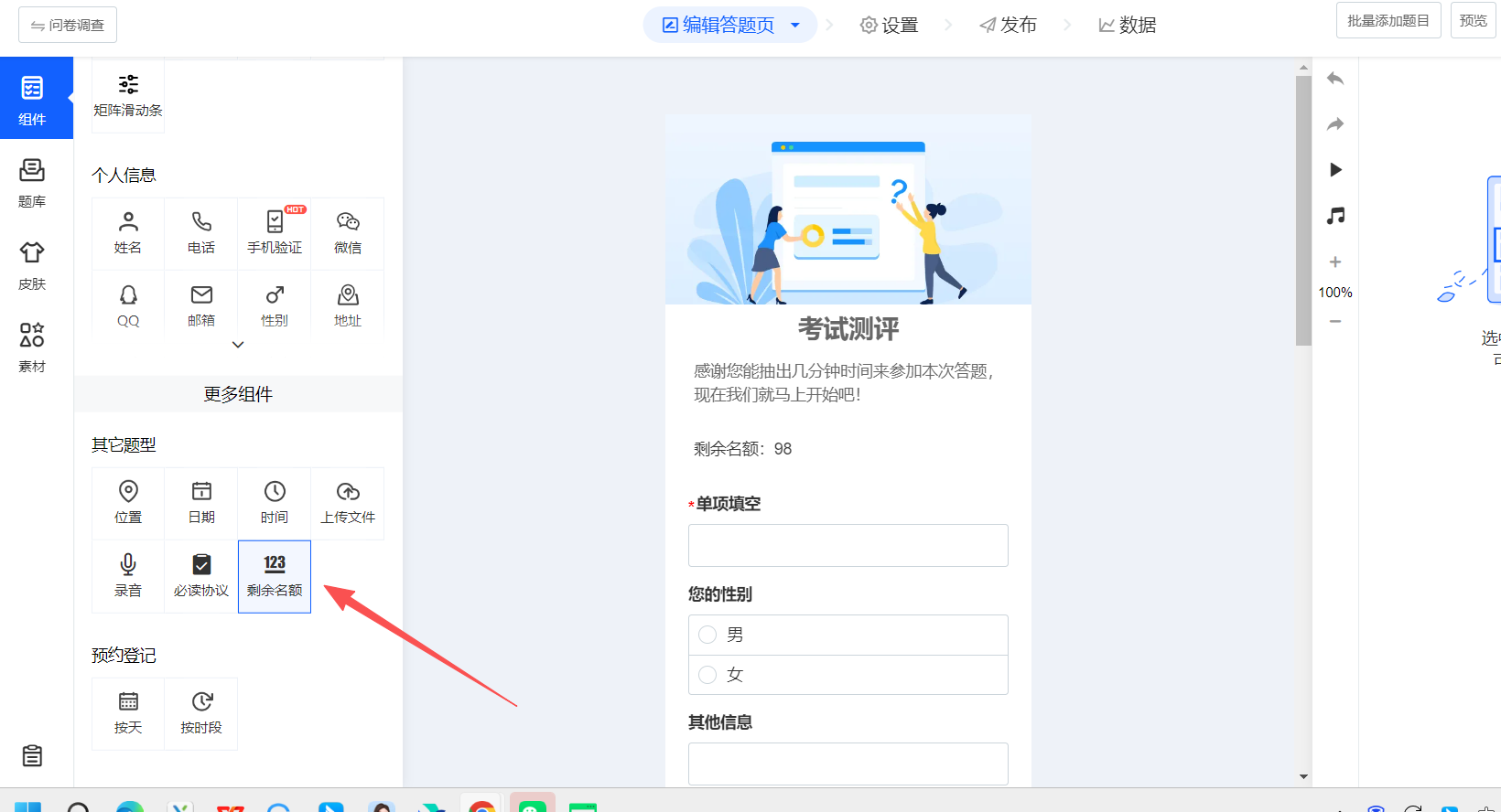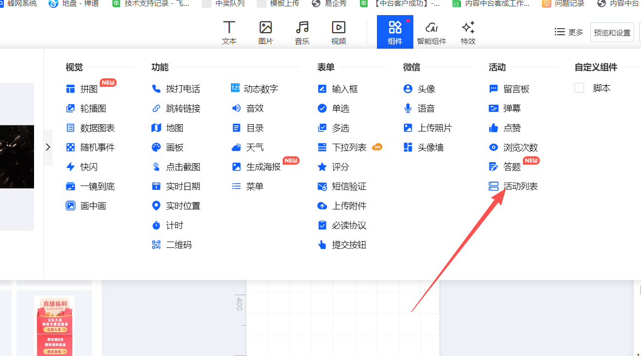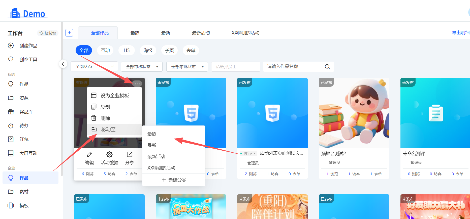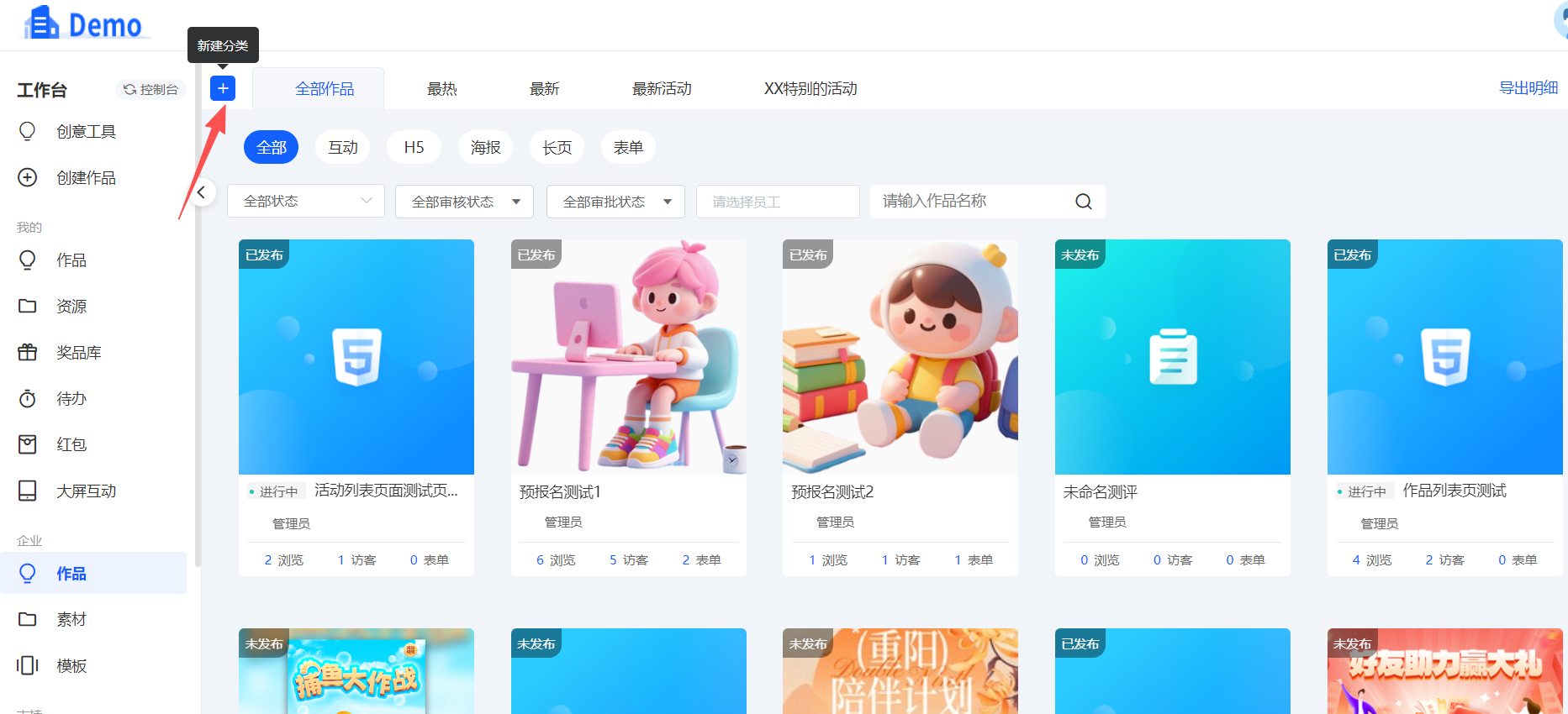 ## 一、创建需要的分类 在企业作品--新增分类,增加需要在活动列表中展示的分类,例如需要有最新和最热分类,如图所示:   ## 二、在表单编辑器创建好需要上架到活动列表的表单作品 1、创建一个表单作品 2、需要添加剩余名额组件,用于查看剩余人数  3、在设置需要选择填写多少关闭表单,这个数量就是本次表单报名的名额,另外建议填写次数限制为1次  4、表单设置添加时间限制,可以在个人中心区分该活动是否结束  ## 三、把创建好的表单作品,按照需求,把活动移动到对应的分类中  ## 四、创建活动列表 1、打开H5编辑器,选择活动列表组件  2、选择作品列表,数据填充方式和展示方式 默认即可  3、搜索条件勾选作品名称,分组按照自己需要的分组勾选,内容详情建议标题+封面+链接  ## 五、创建个人中心 1、打开H5编辑器,在之前的活动列表页上,新增一页,选择活动列表组件 2、选择个人中心接口  其他选择和活动列表勾选一样