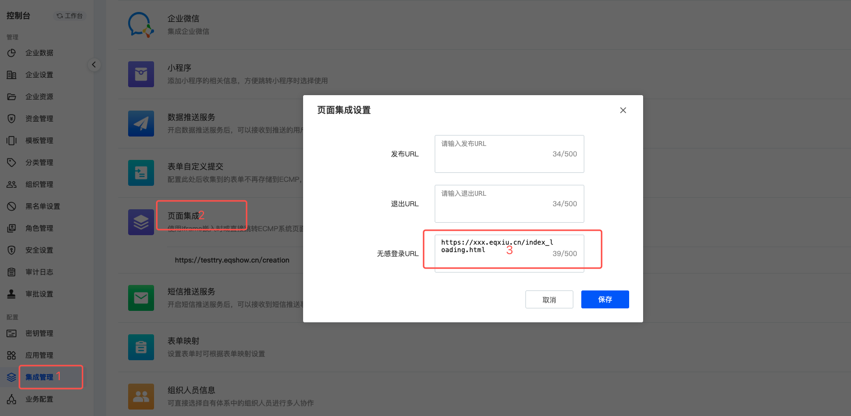 > 该功能可以实现将易企秀的指定界面嵌入企业自有产品,低成本实现产品深度融合。 # 页面集成步聚 1. 实现[单点登录](https://hc.eqxiu.cn/doc/22/ "单点登录")对接,当易企秀界面登录失效时会自动通过单点登录完成登录; 2. 在需要嵌入易企秀页面的地方通过iframe技术嵌入对应页面; - 实现原理  3. 易企秀无感登陆中转页 - 使用说明:当内嵌易企秀,配置的三方中转页与易企秀域名存在跨域时,通过postMessage发送消息,告知父页面登陆过期 - 中转页地址:https://xxx【客户自定义域名前缀】.eqxiu.cn/index_loading.html - 配置方式:  - 代码片段: ```javascript window.parent.postMessage( { eventType: 'EQS_AUTH_TRANSIT', // 事件类型 params: { redirectUrl: '' // 授权信息过期时退出的链接,拿到用户信息后拼接Authorization,跳回来的链接 } }, '*' ) ``` # 可集成页面列表 ### 平台模版&我的\企业作品&作品回收站参数说明: | 参数名称 | 备注 | | --- | --- | | useType| 展示应用类型,eg:?useType=hd 多个 useType=hd,h5 可以选择性组合应用| | hideBar | 隐藏应用类型,默认为显示,eg:?hideBar=1,模版集成时会去除应用类型展示| | hideBack | 隐藏页面的返回按钮,默认展示,eg:?hideBack=1,例如回收站,直接集成。设置无返回按钮 | 内容中台可集成的页面列表如下: | **页面** | **地址** | | --- | --- | | 作品列表全页面 | https://www.eqxiu.cn/embed/creation?secretId=SECRET_ID&Authorization=AUTHORIZATION&type=TYPE | |我的作品全页面| https://www.eqxiu.cn/embed/creation?secretId=SECRET_ID&Authorization=AUTHORIZATION&myProductType=group&hideCreationStatus=${hideCreationStatus}&showSearchInput=${showSearchInput}<br>hideCreationStatus参数说明:指定作品的发布状态是否显示,默认hideCreationStatus不传或者为空展示发布状态;showSearchInput参数说明:指定作品名称搜索框是否显示,此参数与hideBar参数共同使用,单独使用没有作用,默认showSearchInput不传或者为空作品名称搜索框不展示 | |我的作品分类页|https://www.eqxiu.cn/embed/creation?secretId=SECRET_ID&Authorization=AUTHORIZATION&myProductType=type| |我的作品作品页| https://www.eqxiu.cn/embed/creation?secretId=SECRET_ID&Authorization=AUTHORIZATION&myProductType=list(支持&type=hd等作品类型过滤)| |企业模板分类页| https://www.eqxiu.cn/embed/enterpriseTemplate?secretId=SECRET_ID&Authorization=AUTHORIZATION&myBusinessType=type | |企业模板作品页|https://www.eqxiu.cn/embed/enterpriseTemplate?secretId=SECRET_ID&Authorization=AUTHORIZATION&myBusinessType=list| |企业资源企业素材页|https://www.eqxiu.cn/qyMaterial/business?secretId=SECRET_ID&Authorization=AUTHORIZATION&tab=${tab}<br>tab参数说明:指定显示菜单值包含material:素材;template:模版;prize:奖品;也可以组合使用,例如tab=material,template展示素材以及模版。默认tab不传或者为空展示全部| |企业资源企业模版页|https://www.eqxiu.cn/qyMaterial/enterprise?secretId=SECRET_ID&Authorization=AUTHORIZATION&tab=${tab}<br>tab参数说明:指定显示菜单值包含material:素材;template:模版;prize:奖品;也可以组合使用,例如tab=material,template展示素材以及模版。默认tab不传或者为空展示全部| |企业资源企业奖品页|https://www.eqxiu.cn/qyMaterial/prizeManage?secretId=SECRET_ID&Authorization=AUTHORIZATION&tab=${tab}<br>tab参数说明:指定显示菜单值包含material:素材;template:模版;prize:奖品;也可以组合使用,例如tab=material,template展示素材以及模版。默认tab不传或者为空展示全部| | 仅平台模板页面 | https://www.eqxiu.cn/embed/template?secretId=SECRET_ID&Authorization=AUTHORIZATION&type=TYPE| | 仅企业模板页面 | https://www.eqxiu.cn/embed/template/enterprise?secretId=SECRET_ID&Authorization=AUTHORIZATION&type=TYPE | | 企业模板&平台模板页面(tab切换) | https://www.eqxiu.cn/embed/all/template/platform?secretId=SECRET_ID&Authorization=AUTHORIZATION&type=TYPE | | 作品数据统计页面 | https://www.eqxiu.cn/embed/datapage/${creationId}?secretId=SECRET_ID&Authorization=AUTHORIZATION | | 互动编辑器页面 | https://www.eqxiu.cn/gc/${creationId}?secretId=SECRET_ID&Authorization=AUTHORIZATION | | 表单编辑器页面 | https://www.eqxiu.cn/fe/${creationId}?secretId=SECRET_ID&Authorization=AUTHORIZATION | | H5编辑器页面 | https://www.eqxiu.cn/c/${creationId}?secretId=SECRET_ID&Authorization=AUTHORIZATION | | 长页编辑器页面 | https://www.eqxiu.cn/lc/${creationId}?secretId=SECRET_ID&Authorization=AUTHORIZATION | | 海报编辑器页面 | https://www.eqxiu.cn/design/${creationId}?secretId=SECRET_ID&Authorization=AUTHORIZATION | | [图片素材编辑页面](https://hc.eqxiu.cn/doc/1108 "图片素材编辑页面") | https://www.eqxiu.cn/design/create/blank?secretId=SECRET_ID&Authorization=AUTHORIZATION&filePath=filePath&width=width&height=height| | [图片素材美化页面](https://hc.eqxiu.cn/doc/1108 "图片素材美化页面") | https://www.eqxiu.cn/design/tool/photo?secretId=SECRET_ID&Authorization=AUTHORIZATION&filePath=filePath| | 移动端 | https://www.eqxiu.cn/wpeip/mall/home?secretId=SECRET_ID&Authorization=AUTHORIZATION&mallType=${mallType}<br>mallType参数说明:h5、hd-互动、h2-海报、h5e-表单 | | 其它通用页面 | 需在需要集成的页面URL中,添加一个 URL Query Param: nolayout=1,嵌入的页面将隐藏原生的菜单栏| “互动编辑器页面”提供了一组参数(将以下任一参数拼到URL上),可以用来控制页面是否可编辑的效果: ``` approval=disableEdit 作品状态为审批中时,隐藏保存和发布按钮,禁用编辑 approval=disablePage 作品状态为审批中时,禁用整个页面 disableEdit=1 作品在任何状态时,隐藏保存和发布按钮,禁用编辑 disablePage=1 作品在任何状态时,禁用整个页面 ``` ## 参数说明 - SECRET_
