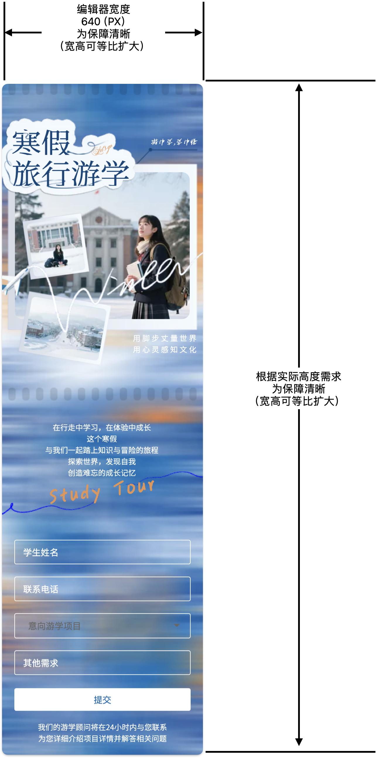 1.尺寸:定宽不定高,宽度:640像素,高度可参考市面主流手机进行内容设计。宽高比可等比扩大。