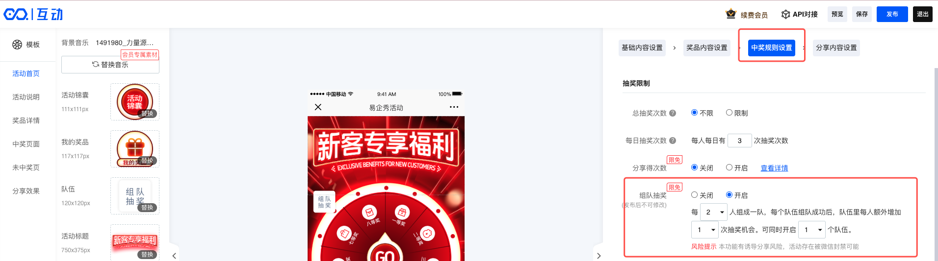 进入互动编辑器内,点击中奖规则设置,开启【组队抽奖】