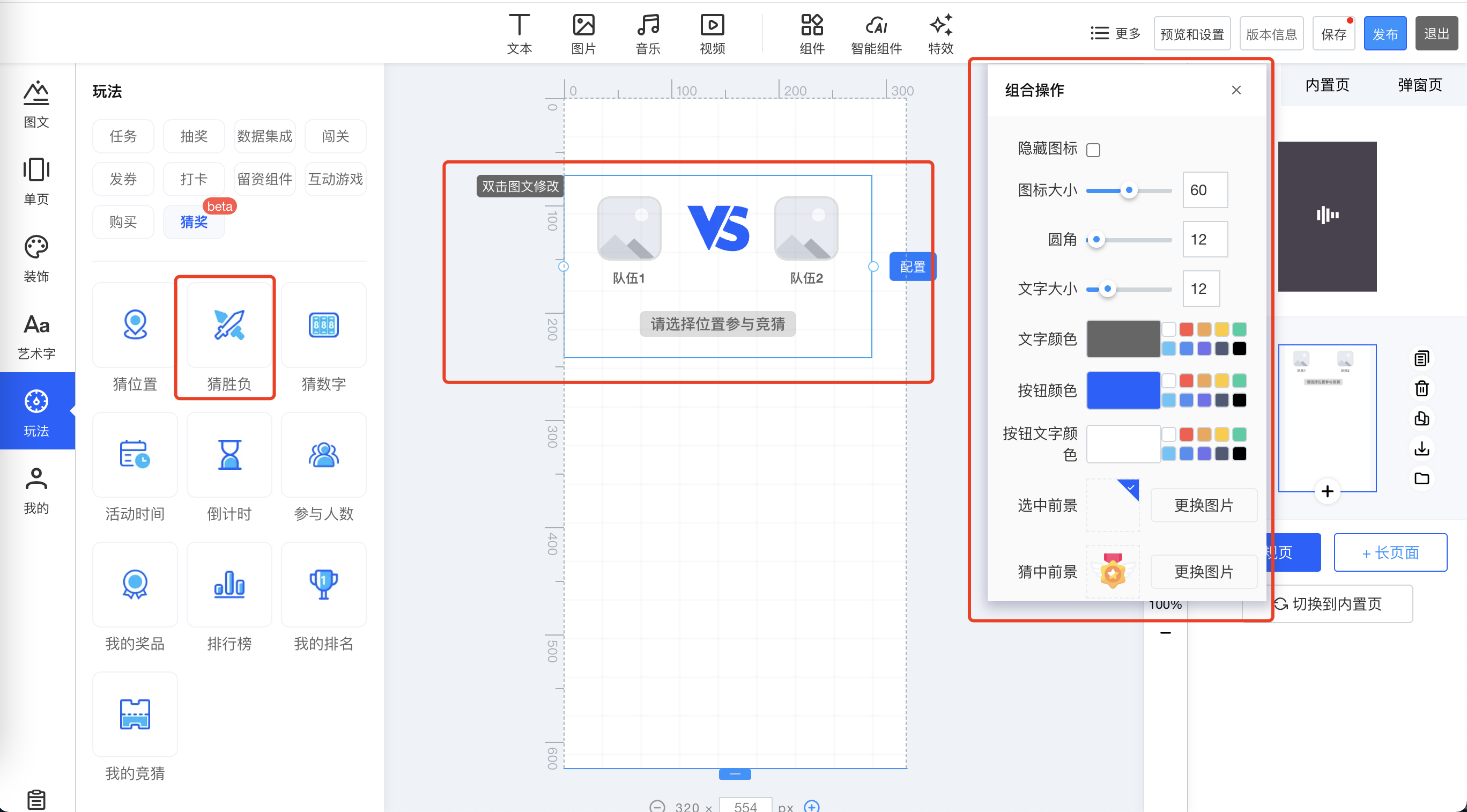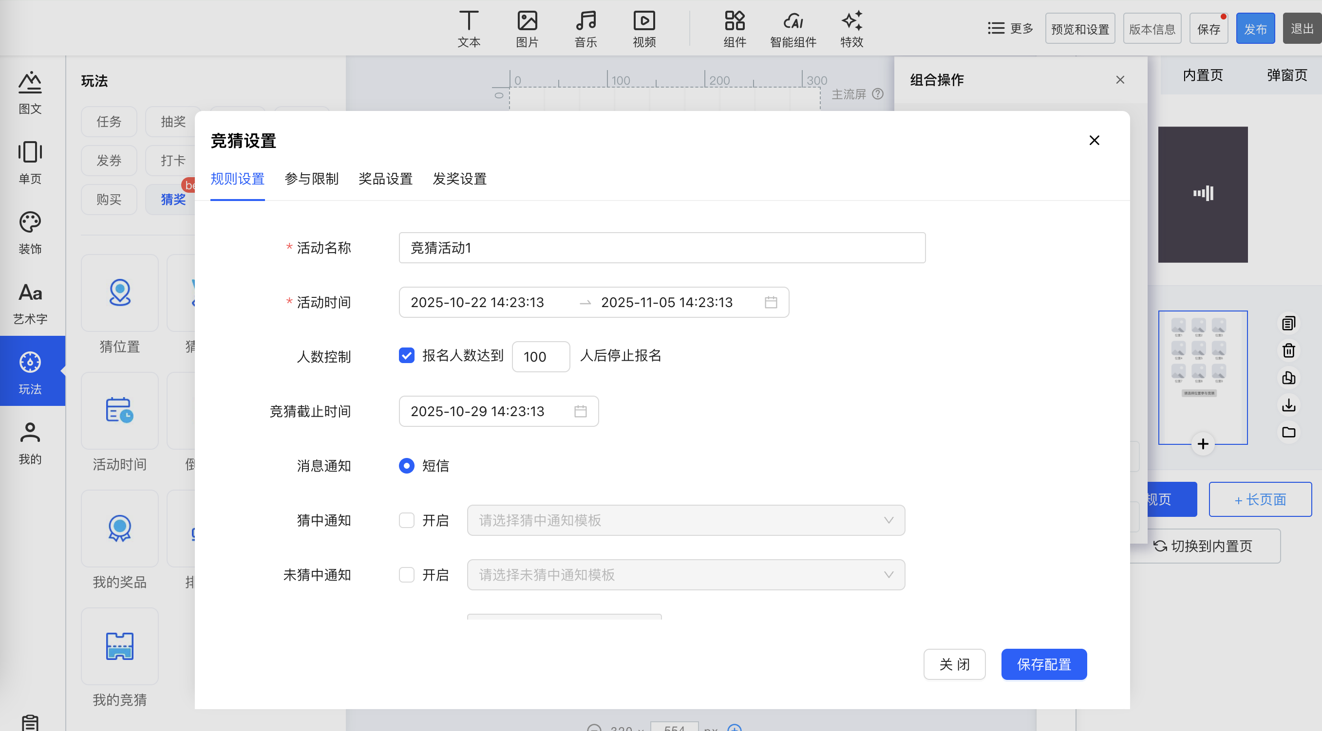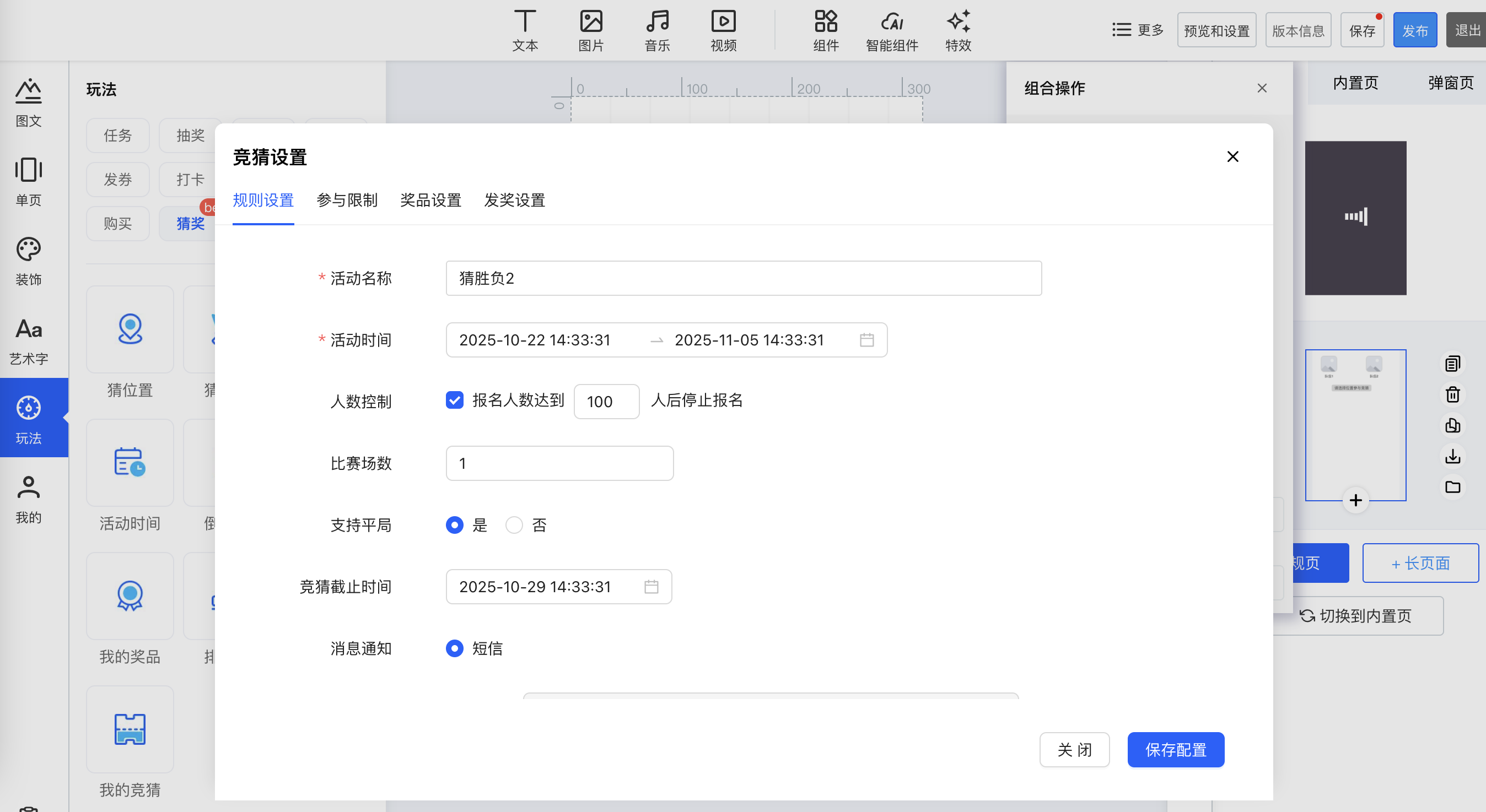 点击猜胜负组件,猜胜负组件出现在画布中,同时弹出竞猜设置进行设置,包括规则设置、参与限制、奖品设置和发奖设置: