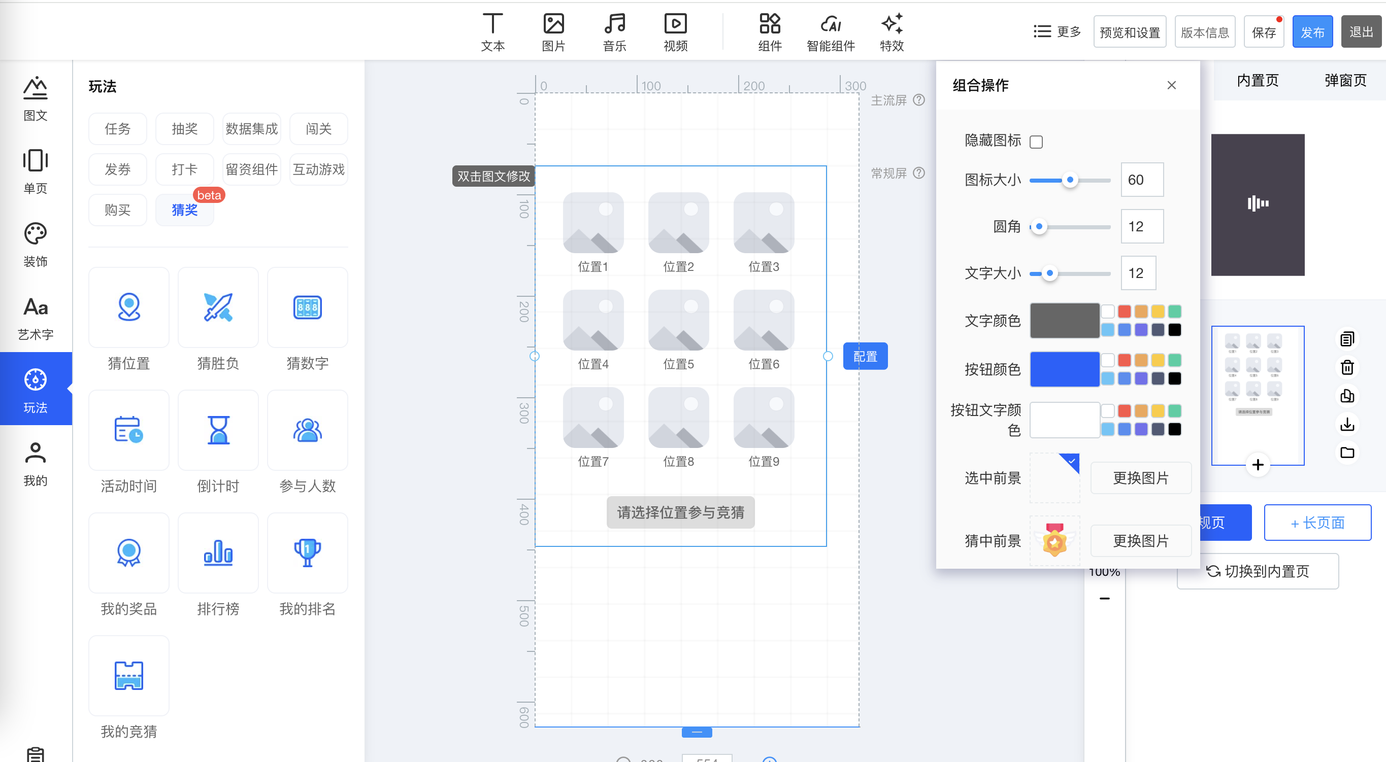 点击猜位置组件,猜位置组件出现在画布中,同时弹出竞猜设置进行设置,包括规则设置、参与限制、奖品设置和发奖设置: