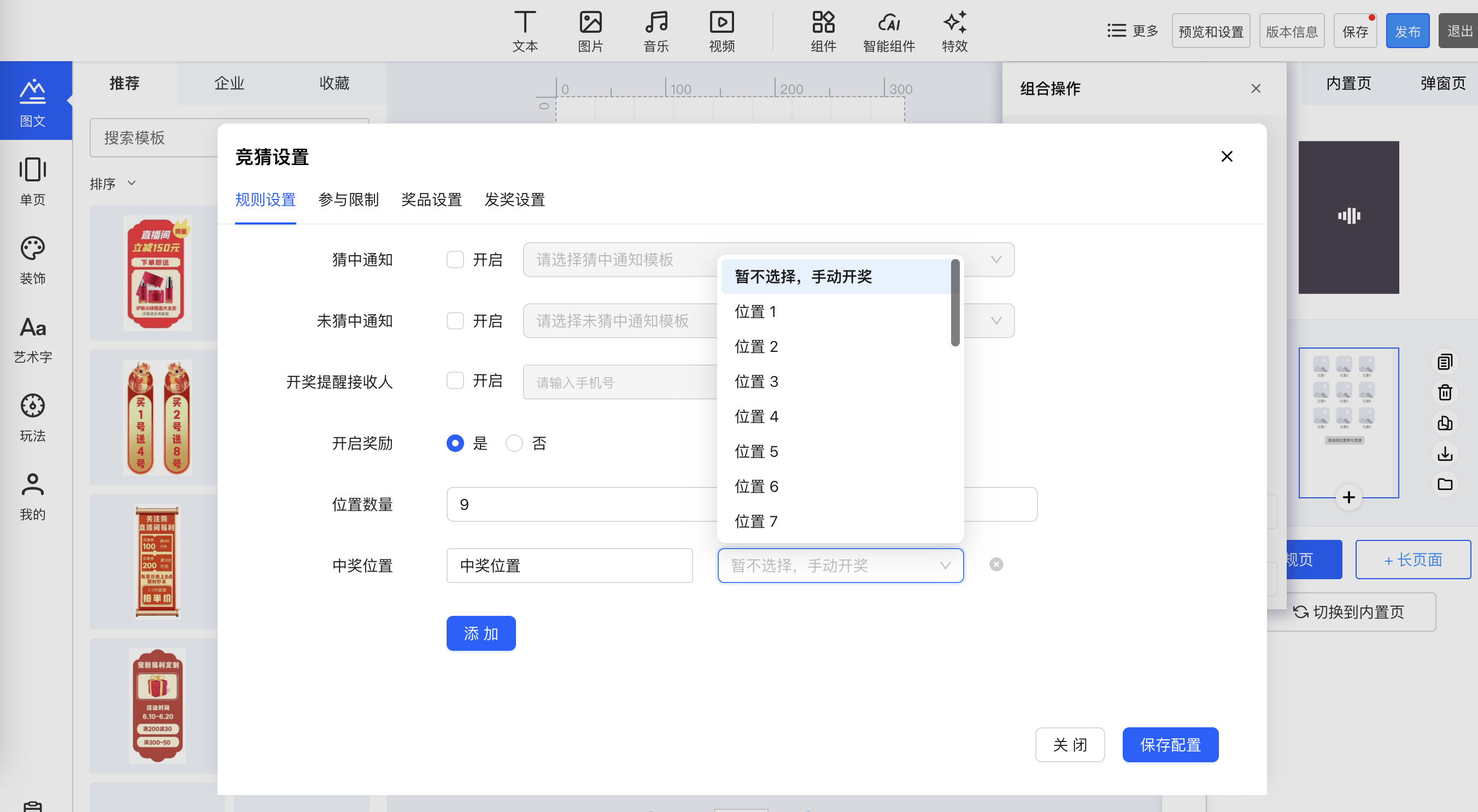 可以根据业务场景选择猜奖的位置,并且设置猜奖的中奖位置,如果之前知道中奖位置,直接设置即可,如果是等开奖才知道中奖位置,可以选择“暂不选择,手动开奖”