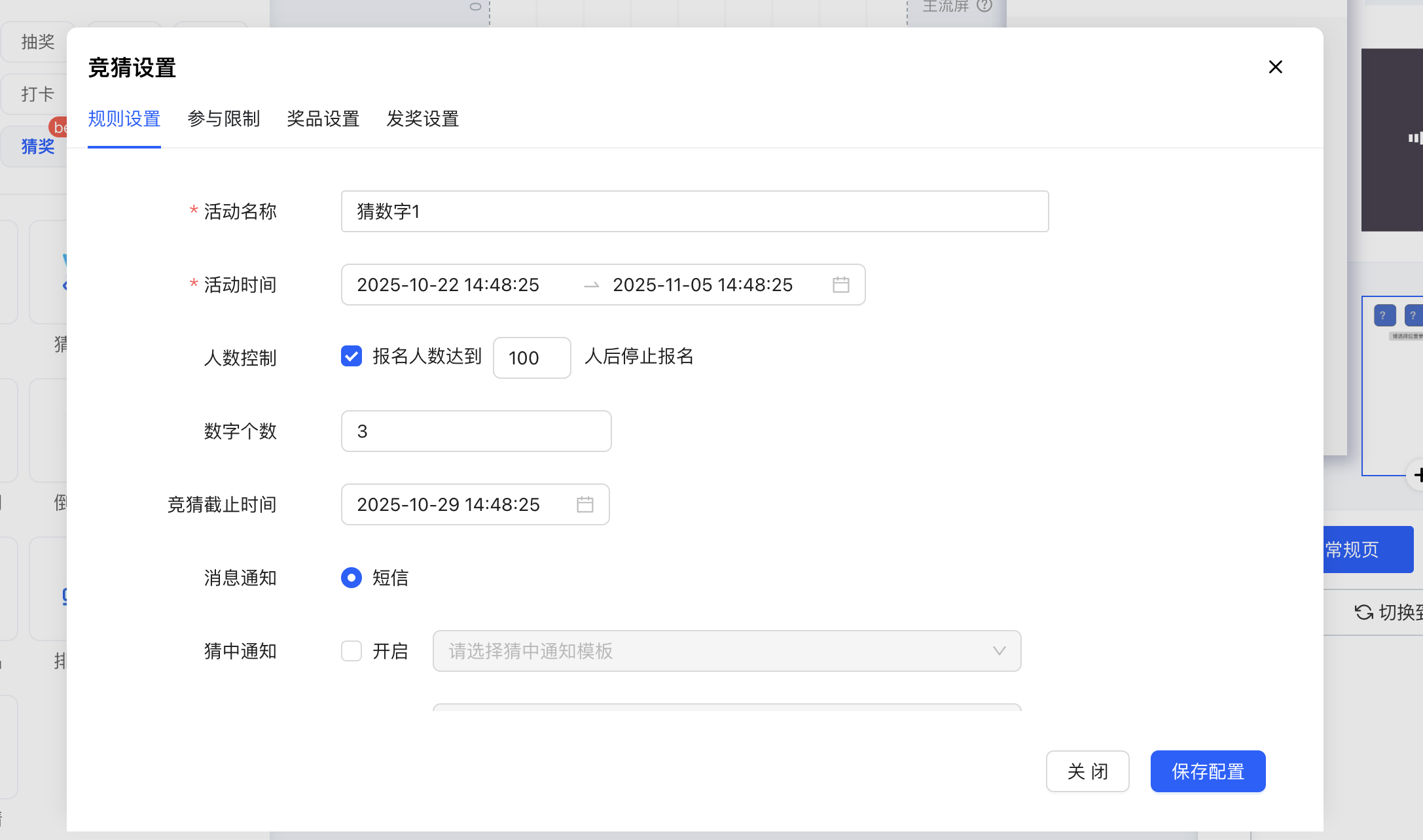 点击猜数字组件,猜数字组件出现在画布中,同时弹出竞猜设置进行设置,包括规则设置、参与限制、奖品设置和发奖设置: