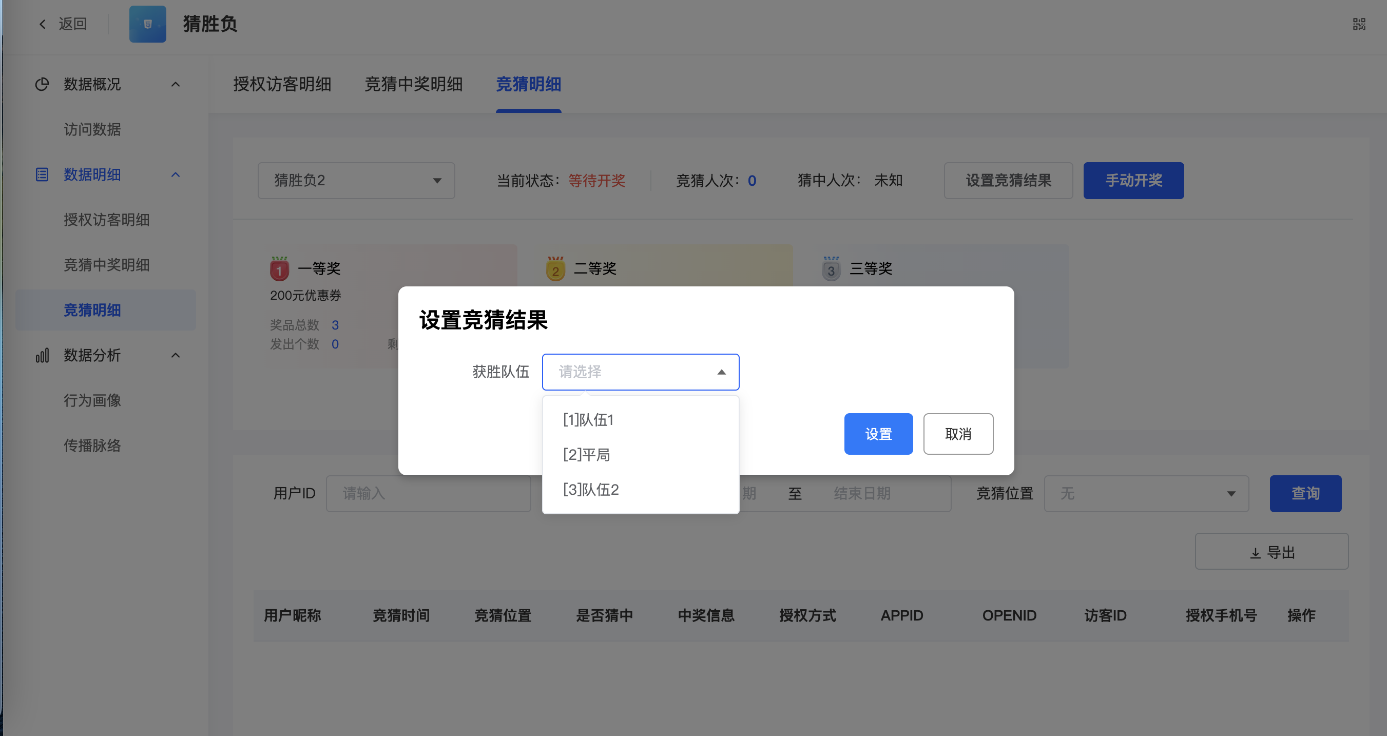 猜胜负主要用于猜比赛的胜负,需要等真实比赛结束后,拿到比赛结果才可以开奖,所以在配置页面没有配置获奖队伍的地方,只能等开奖时间到了,知道比赛结果,再点击活动管理-竞猜明细-设置竞猜结果,并且手动开奖