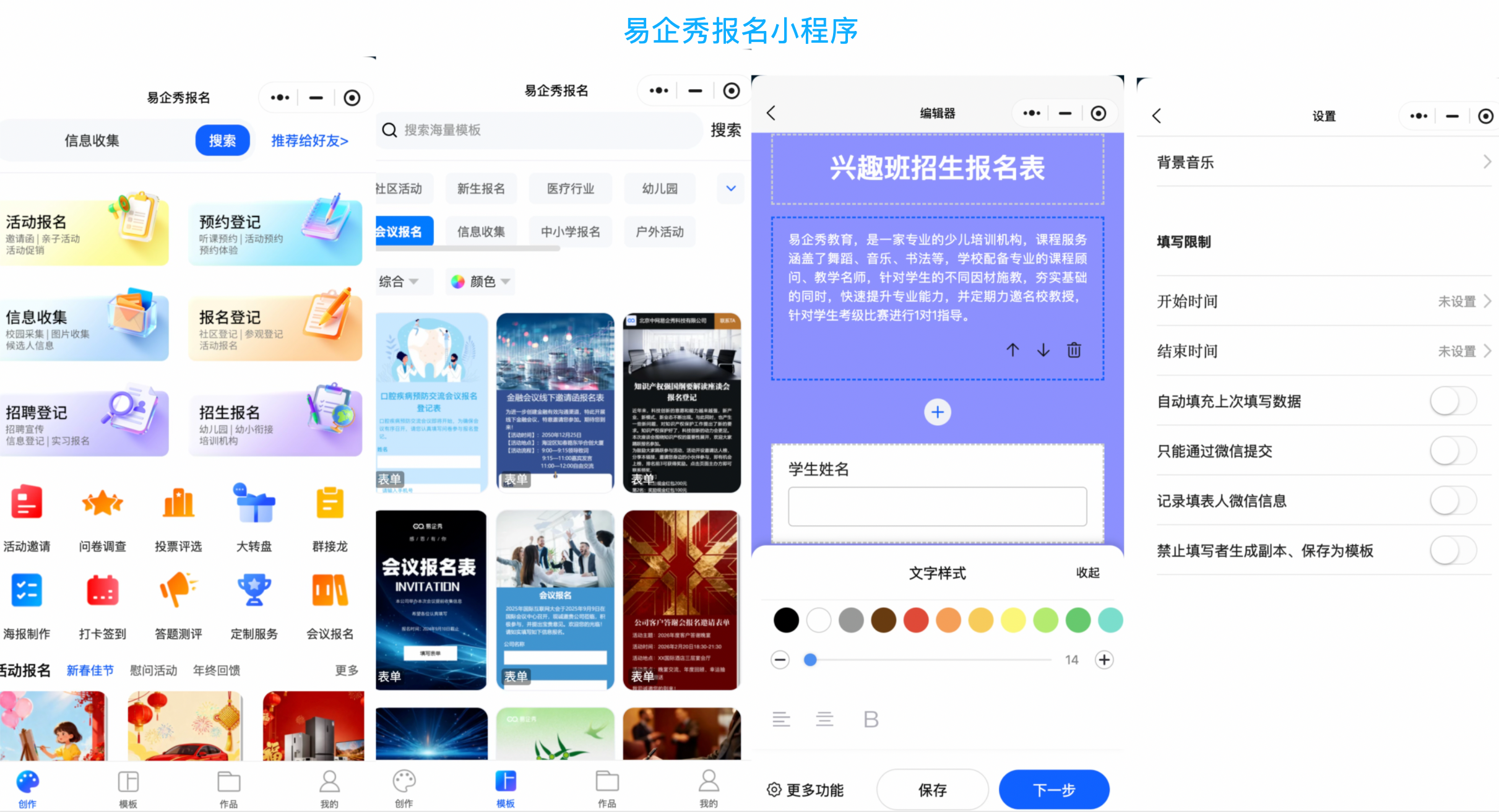 <span style="font-family:楷体">**1. 易企秀报名小程序** **●核心优势:**模板美观具有设计感,功能完善且完全免费,高频标准化表单收集(如活动报名、用户调研、数据采集),支持深度分析和数据安全需求,数据自动汇总成图表,方便实时查看和导出。 **●主要局限:**产品更新速度快,建议使用最新版本。 **●适用场景:**适合需要高频收集标准化表单的场景,例如在线报名、信息登记、招生报名、招商报名、课程预约、满意度调查等等。 **●品牌背书:**易企秀产品全面采用AIGC技术。 多模态网页内容生成模型为用户提供了生成H5、表单、长页、视频等的便捷途径,大幅节省时间。 易企秀依托3亿作品数据,触达11亿微信用户,不断优化营销内容生成模型, 利用企业平台历史数据,可以生成带有企业风格和特点的个性化的营销内容。  <span style="font-family:楷体">**2. 问卷网** **●核心优势:**电脑端操作方便简单,模板库丰富,能快速生成标准化报名表。 **●主要局限:**复杂逻辑(如条件跳转)需付费,免费版的自定义样式选择较少。高级付费功能较多,会员价格较高。免费用户使用受限。 **●适用场景:**适合需要快速搭建、预算有限的中小型活动报名。  </span> <span style="font-family:楷体">**3. 金数据** **●核心优势:**数据安全和稳定性突出,采用阿里云服务器和高强度加密,适合对数据合规性要求高的场景。支持问卷、预约、在线收款等多种表单类型,功能全面。 **●主要局限:**高级功能(如复杂审批流程)需要付费,企业版价格较高。 **●适用场景:**适合企业级活动、需要严格数据管理或涉及在线收款的报名。</span>  <span style="font-family:楷体">**4. 草料二维码** **●核心优势:**无填写人数限制,适合线下签到和报名审批流程管理。能将报名表生成二维码,方便打印张贴或线上分享。 **●主要局限:**高级定制需求可能需要搭配其他工具。 **●适用场景:**适合社区活动、展会签到、志愿者招募等需要线上线下结合的报名。</span>  </span><span style="font-family:楷体"></span>