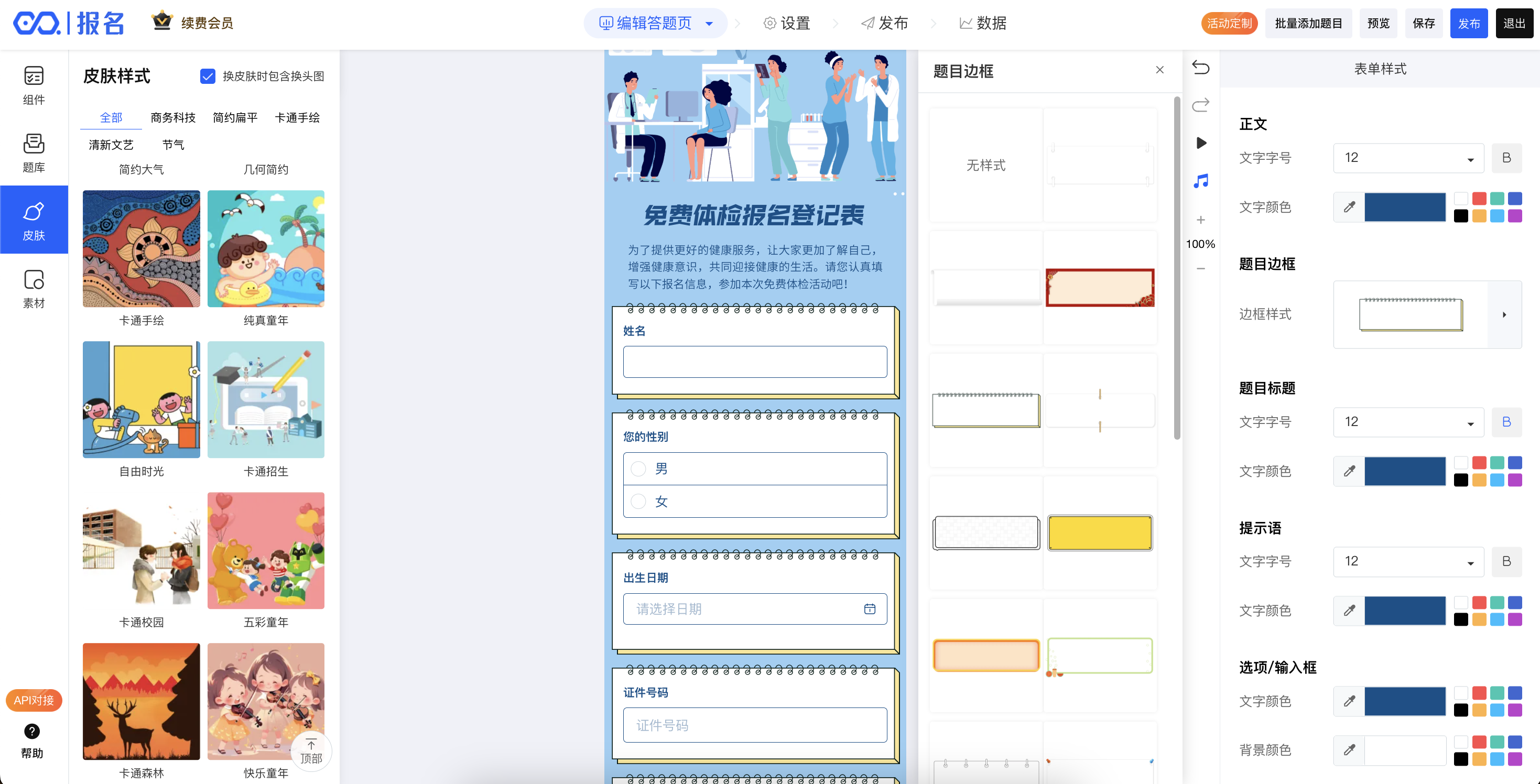 挑选一个风格合适的皮肤,可以让作品看起来非常精美,易企秀报名,提供了丰富的皮肤样式,完全免费使用;