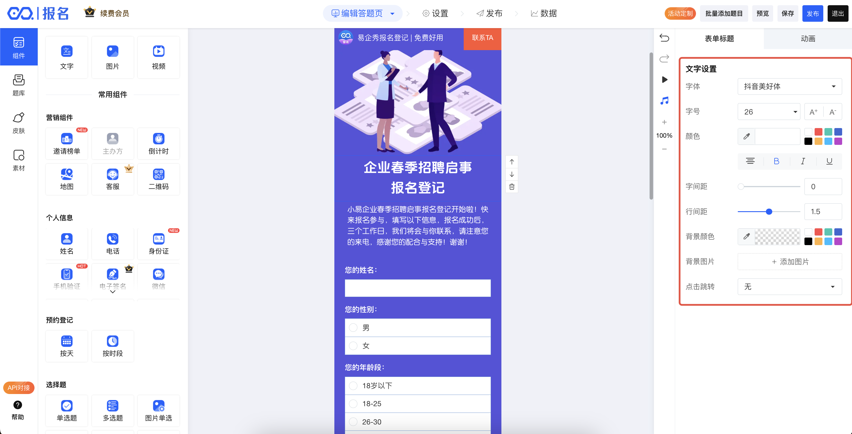 具体有:标题、正文、题目标题、提示语、选项/输入框、按钮等的文字颜色均可调整。