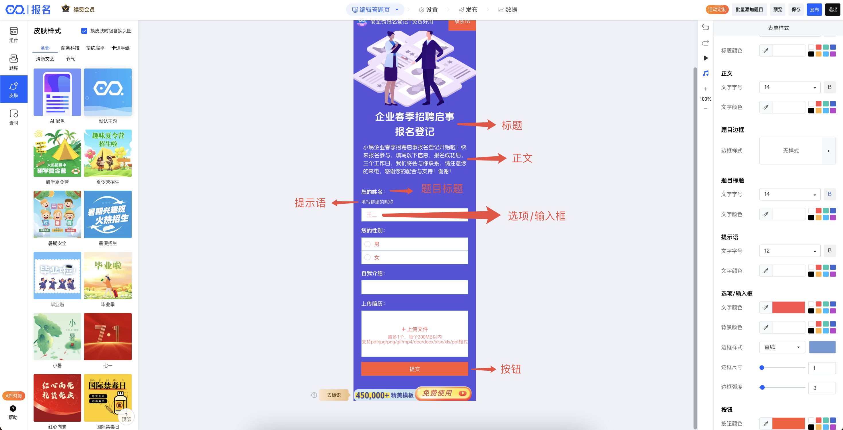 如下图示,在报名编辑器中,先点击编辑器左侧“皮肤”按钮,在右侧即可看到全部表单样式的可设置内容。