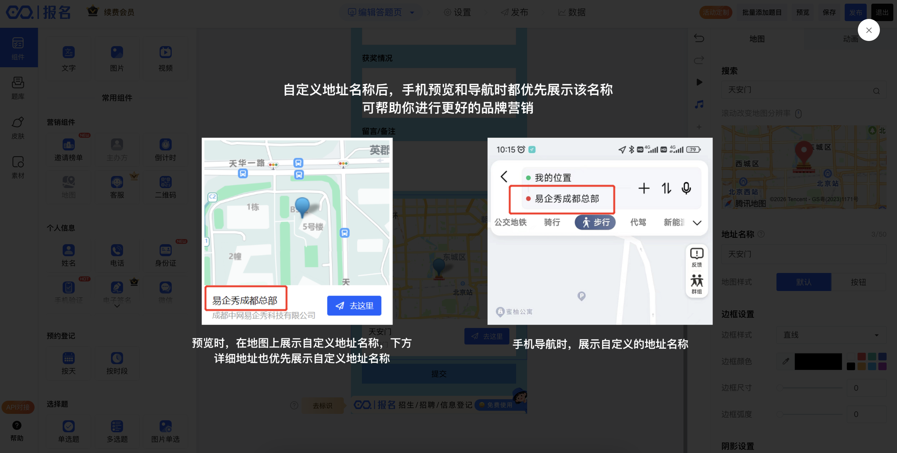 1、在各种邀请函、活动报名、企业招聘、宣传等场景,添加地图,方便受邀人快速查看到地址;