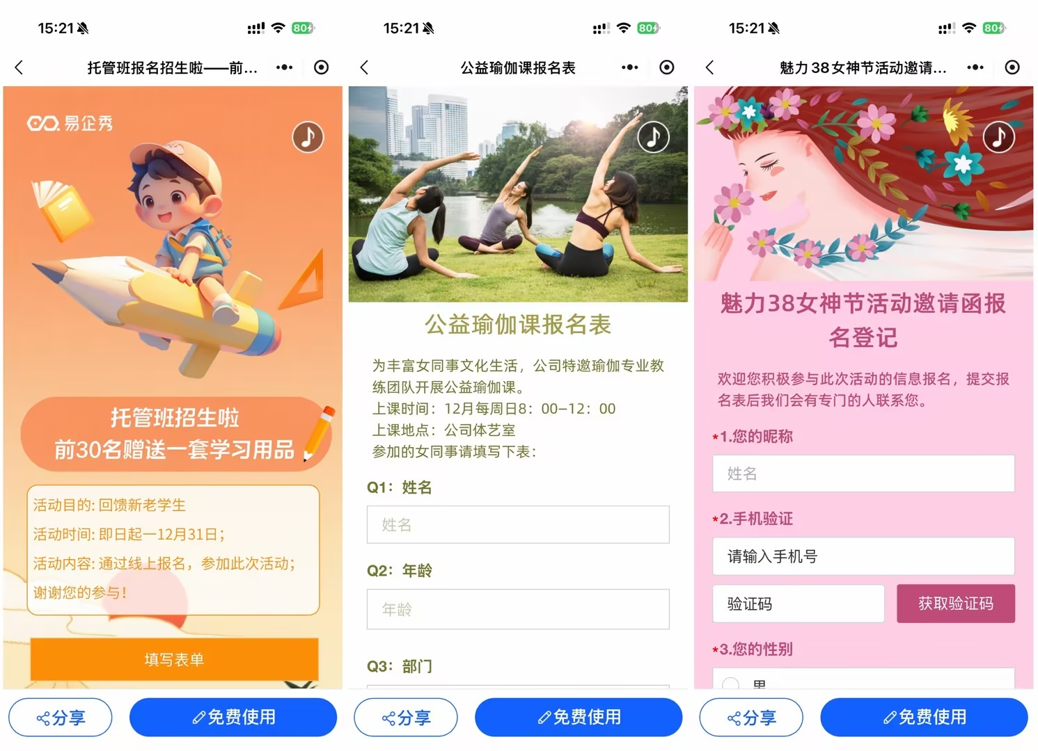 - 特点:强在设计赋能,显著降低非专业用户制作高颜值报名页的门槛;且易企秀报名小程序是完全免费的。