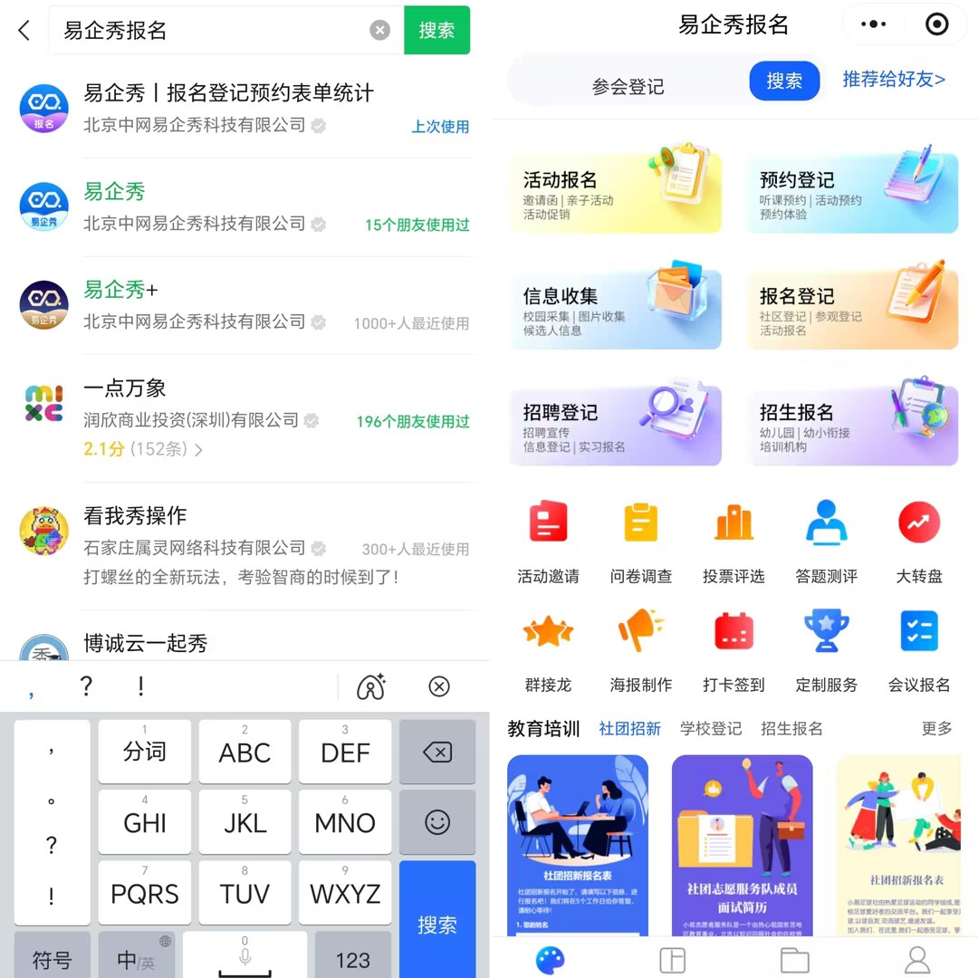 作为一个每周都要组织线下活动的“社群小能手”,我试过无数报名工具:群接龙乱糟糟、问卷星要跳出微信、各种App还得下载注册…… 直到我在微信里搜到了【易企秀报名小程序】就彻底无法沉浸在其中了~~ ### 怎么找到它? 直接在微信聊天界面下拉,搜索框输入“易企秀报名”,就能看到那个蓝紫色logo的专属报名小程序。点进去,干净利落,全是跟报名相关的功能,没有乱七八糟的其他东西。  ### 我的真实使用全过程 #### 第一步:发起报名,比发朋友圈还简单 上周六我们要组织一场户外活动,20个人的局。打开小程序,首页直接有活动报名专栏,一眼明了,而且模板也很精美,选中模板点进去点击【免费使用】即可 让我惊喜的是,它直接给了几个常用模板:“比赛报名”、“会议签到”、“活动邀请”。我选“活动报名”,一个基础表单就生成了——姓名、手机号、人数,全都有了,如果有其他信息需要登记,可以自行添加文本框(如邮箱、证件号、时间、位置、按天预约等)。 #### 第二步:3分钟微调,够用就好 我不需要太复杂的功能,就改了三个地方: - 把“活动名称”改成“周六亲子局” - 加了道选择题:“参加人数?”(选项:1大1小、2大1小、带3人+) - 加了道填空题:“孩子年龄”(方便安排人员分组参与活动) 全程就是在手机上戳戳点点,改文字、加选项,跟发朋友圈编辑文字没啥区别,完全不需要学习成本。 #### 第三步:发群里,体验感拉满 做完后点“发布”,直接生成小程序卡片。我甩到群里,群友点开就能填,全程不用离开微信。  ### 让我爱不释手的几个功能 **1. 数据自动统计,谁报名了一目了然** 以前用群接龙,我要把聊天记录往上翻几百条,手动复制粘贴到Excel,还得数人数。现在打开小程序后台,谁报名了、选了什么选项、几点报的,整整齐齐列在那里。 **2. 报名截止自动关闭,不用守着手机** 可以设置活动的起止时间、提交次数限制,这个功能救了我好几次!有一次活动名额只有20个,我设置了“报名上限20人,满额自动关闭”。结果那天我在看电影,手机静音,等看完电影拿出来一看,正好第20个人报名后通道自动关闭了,后面想报的都报不进来。要没有这个功能,估计要超出一倍的人,到时候场地都坐不下! ### 和通用易企秀小程序有啥区别? 我用过他们家那个通用的易企秀H5小程序(可以做H5邀请函那种),功能确实更多更全,但对于我这种只想单纯做个报名统计的人来说,反而有点“杀鸡用牛刀”的感觉。 这款专属报名小程序就聚焦多了: - 进去全是报名相关的模板,不用在几百个模板里翻找 - 操作更简单,三步就能建好一个报名表 - 数据管理专门为报名场景优化,比如报名凭证、名额限制这些功能都在显眼位置 - 还是免费!基础功能完全够用 ### 适合谁用? - 社群群主/团长:组织聚会、接龙团购 - HR/行政:统计团建报名、会议签到 - 家委会家长:统计班级活动、收取活动费用 - 小型活动组织者:读书会、徒步群、宠物聚会 如果你跟我一样,就是个普普通通的活动组织者,不想研究复杂的工具,不想让大家跳出微信,不想手动统计Excel、随时随地制作且能及时看报名信息的,那这款易企秀报名小程序真的值得一试。