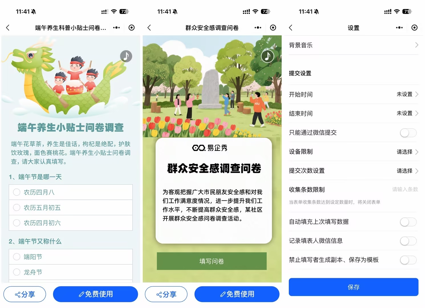 做《社区干部民主评议》,我挑了一个蓝白配色的简洁模板,看起来正式又不压抑;做《端午节包粽子活动意向调查》,我选了一个带粽子插画的喜庆风格,发到居民群里,好几个阿姨点赞:“小张,这次的问卷看着就想过节!”