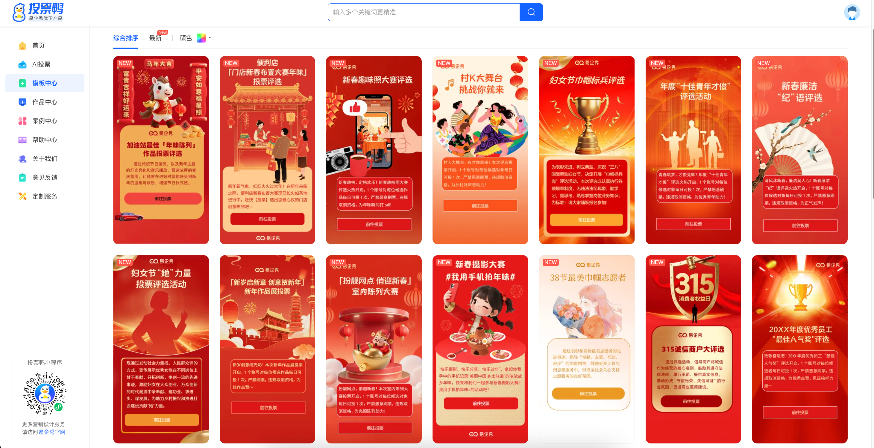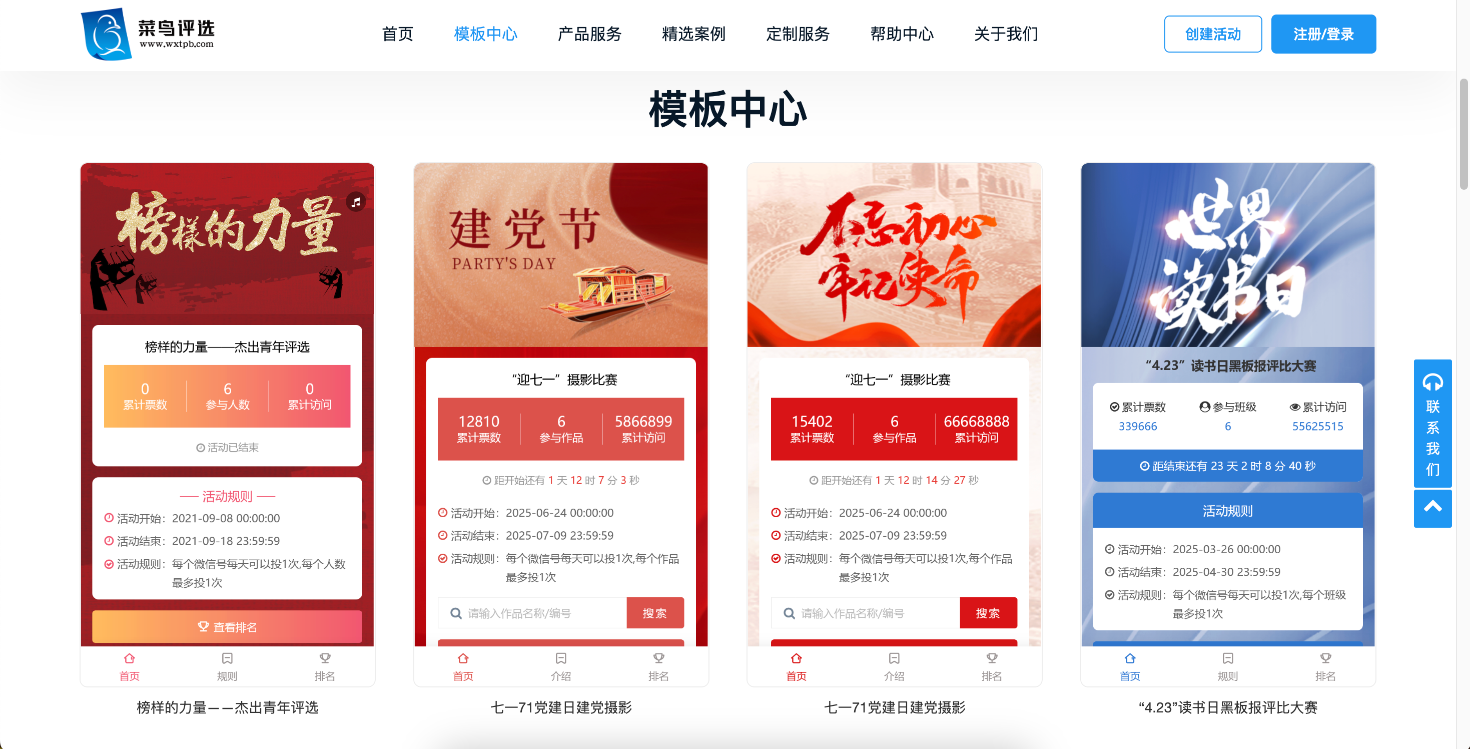 3)3000+精美投票模板,全面覆盖优秀人物评选、先进团体投票、书画作品评选、少儿才艺评选、摄影大赛、广场舞大赛、门店陈列大赛、年度评选、节目评选、校园投票、廉洁宣传、萌宝评选等各种投票场景之外,也让活动页面足够酷炫!