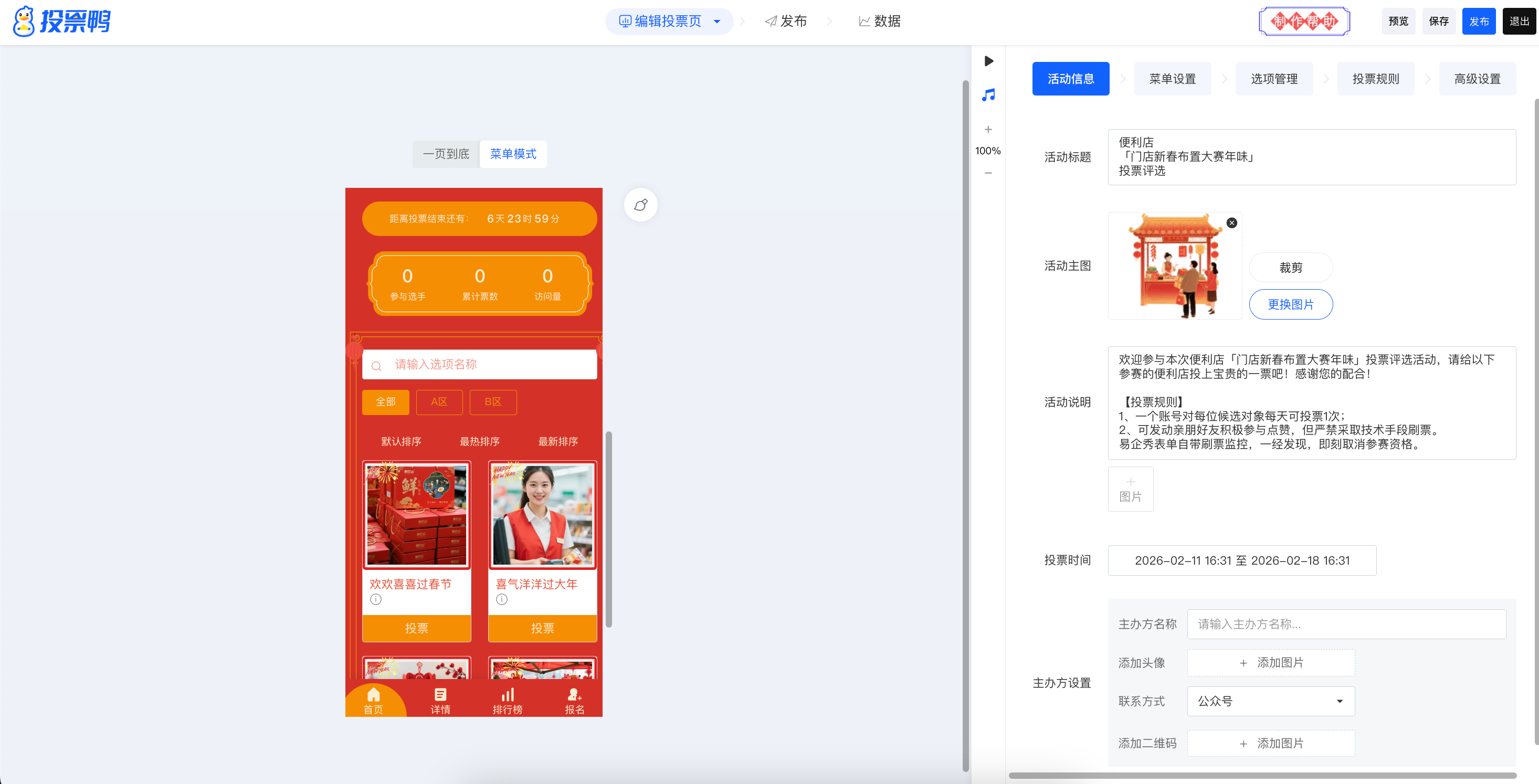 4)可视化极简编辑操作,使用模板创建投票活动,仅需按步骤、流程化的简单修改活动说明、编辑选手信息并设置好投票规则,即可轻松完成制作;