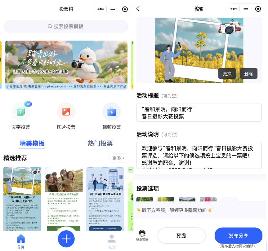 投票鸭作为易企秀旗下单独拆分的投票工具产品,核心优势在于完全免费无限制 + 易企秀生态协同 + 支撑千万级访问 + 海量正版模板 + 智能防刷 + 全链路数据闭环。
