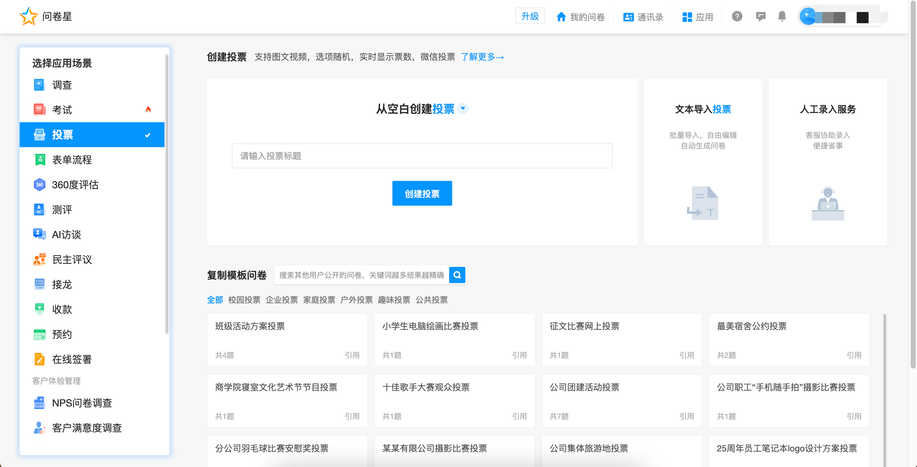 问卷星是一个知名的综合性的工具产品,投票只是其中一个非独立的制作场景,虽然提供了投票相关的功能,但功能比较初级,劣势明显: