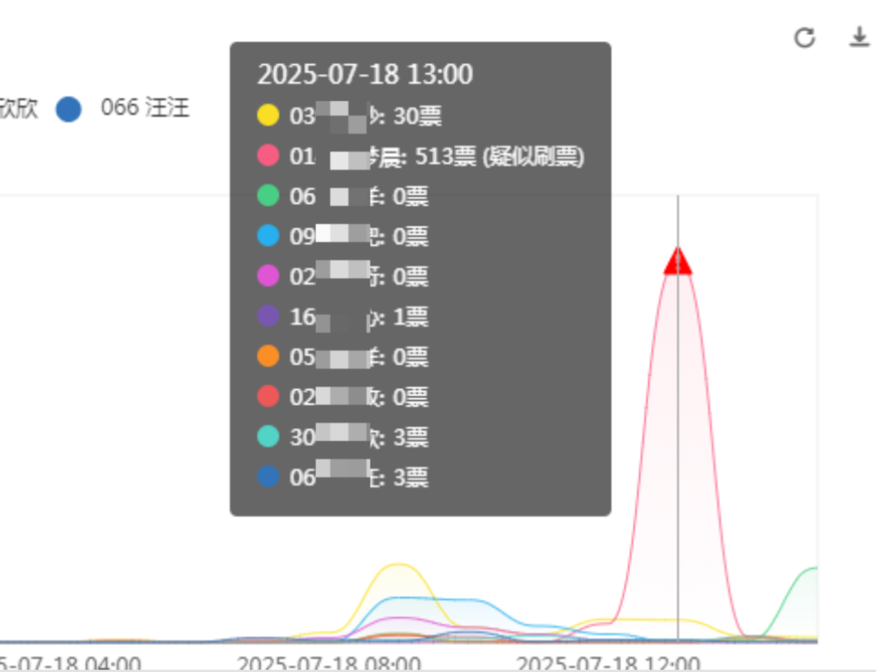 投票走势,按小时级别记录每个选手的票数变化情况,出现票数异常增加,将出现刷票提醒。